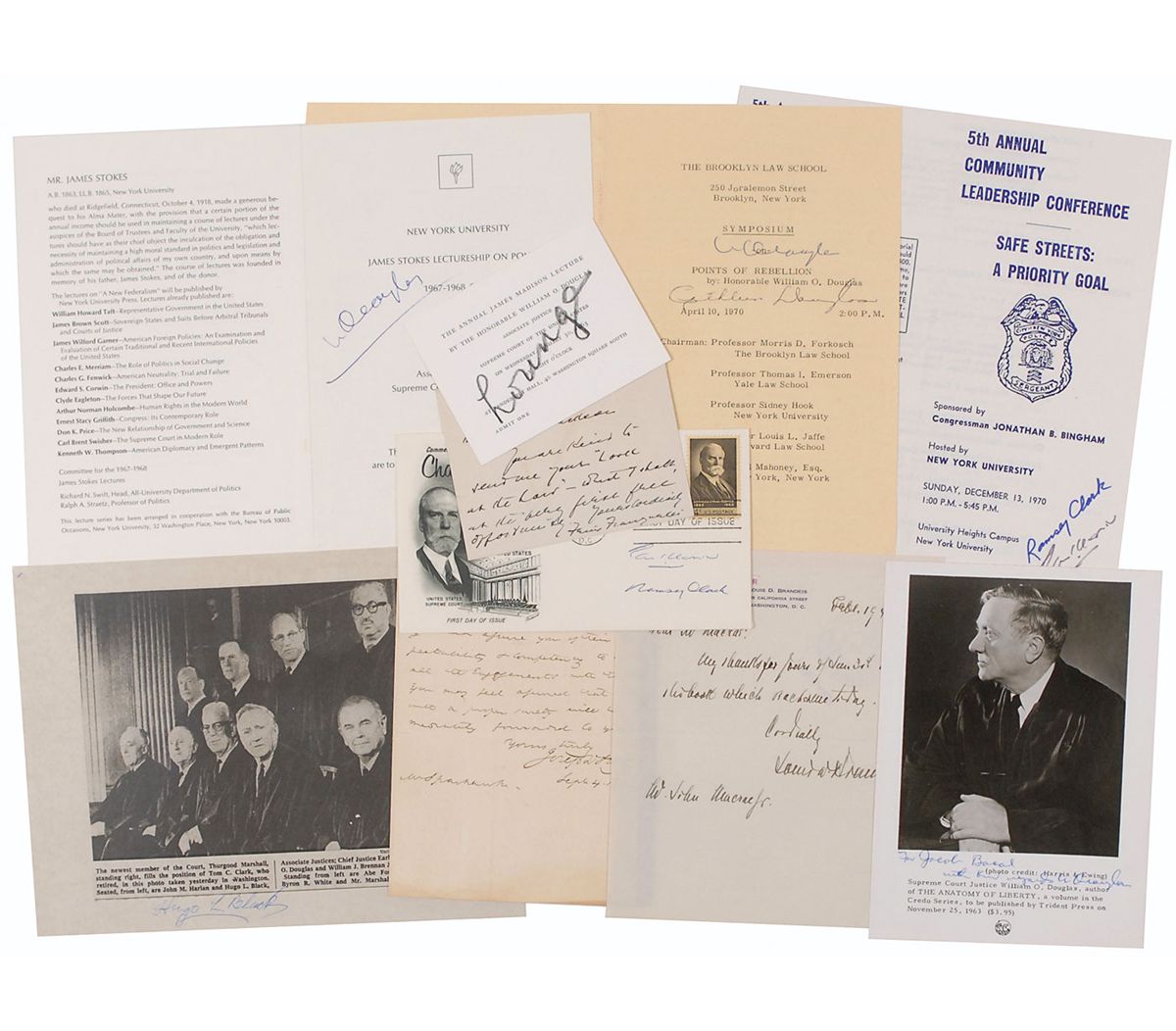 Collection of eight items, each signed by a Supreme Court justice, including: Louis Brandeis (ALS), Felix Frankfurter (ANS), Hugo L. Black (SP), William O. Douglas (SP and two programs), Tom C. Clark (FDC and brochure), and Joseph Story (ALS). The Clark FDC is also signed by Ramsey Clark; the Clark program bears a Ramsey Clark autopen signature; and one Douglas program is also signed by his wife, Cathleen Douglas. In overall very good to fine condition. Accompanied by an unsigned postcard of Black.
