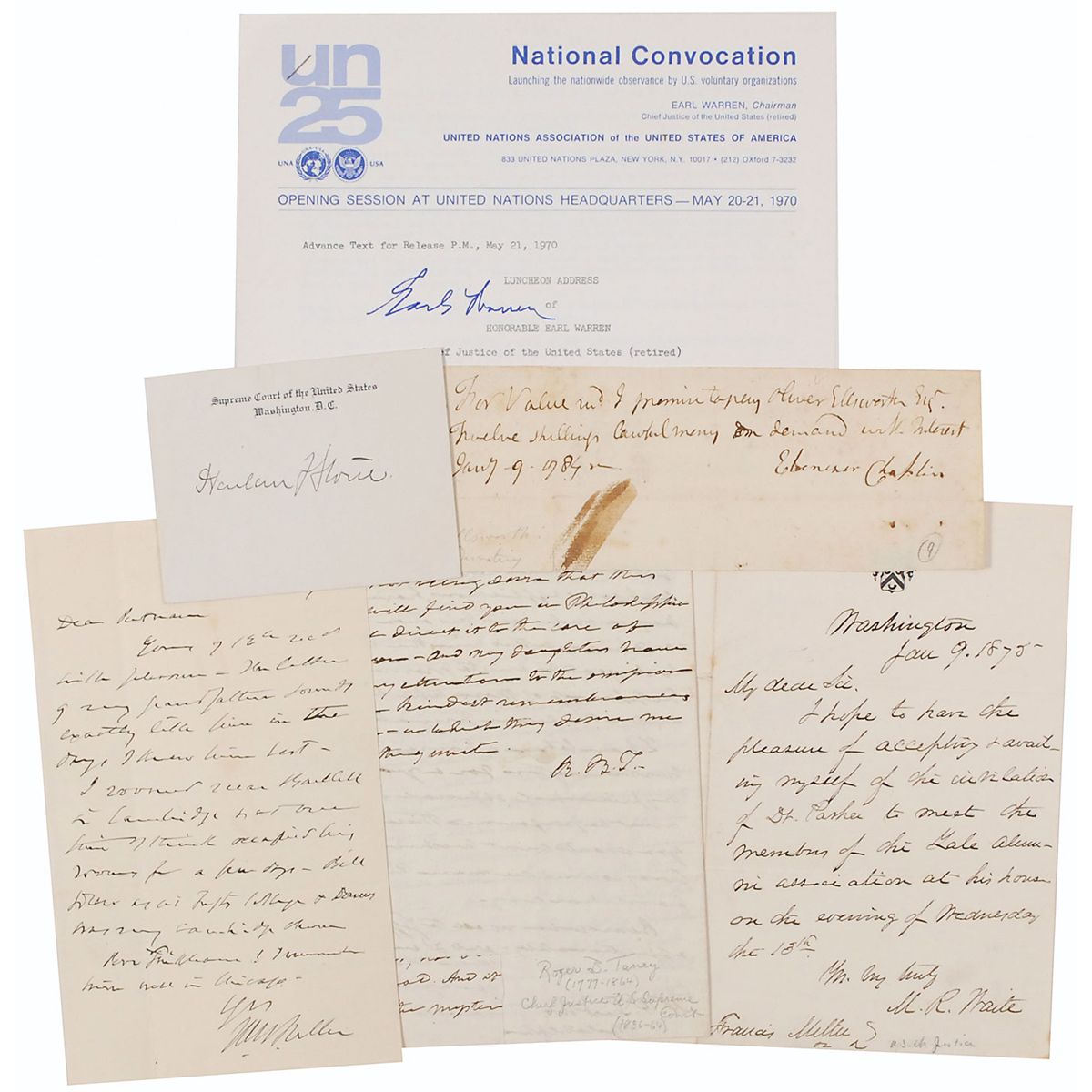 Collection of six items, each signed by a Supreme Court Chief Justice, including: Oliver Ellsworth (third-person ADS), Melville Fuller (ALS), Morrison Waite (ALS), Harlan F. Stone (signature), Roger B. Taney (ALS), and Earl Warren (press release). In overall fine condition.