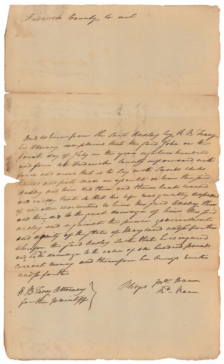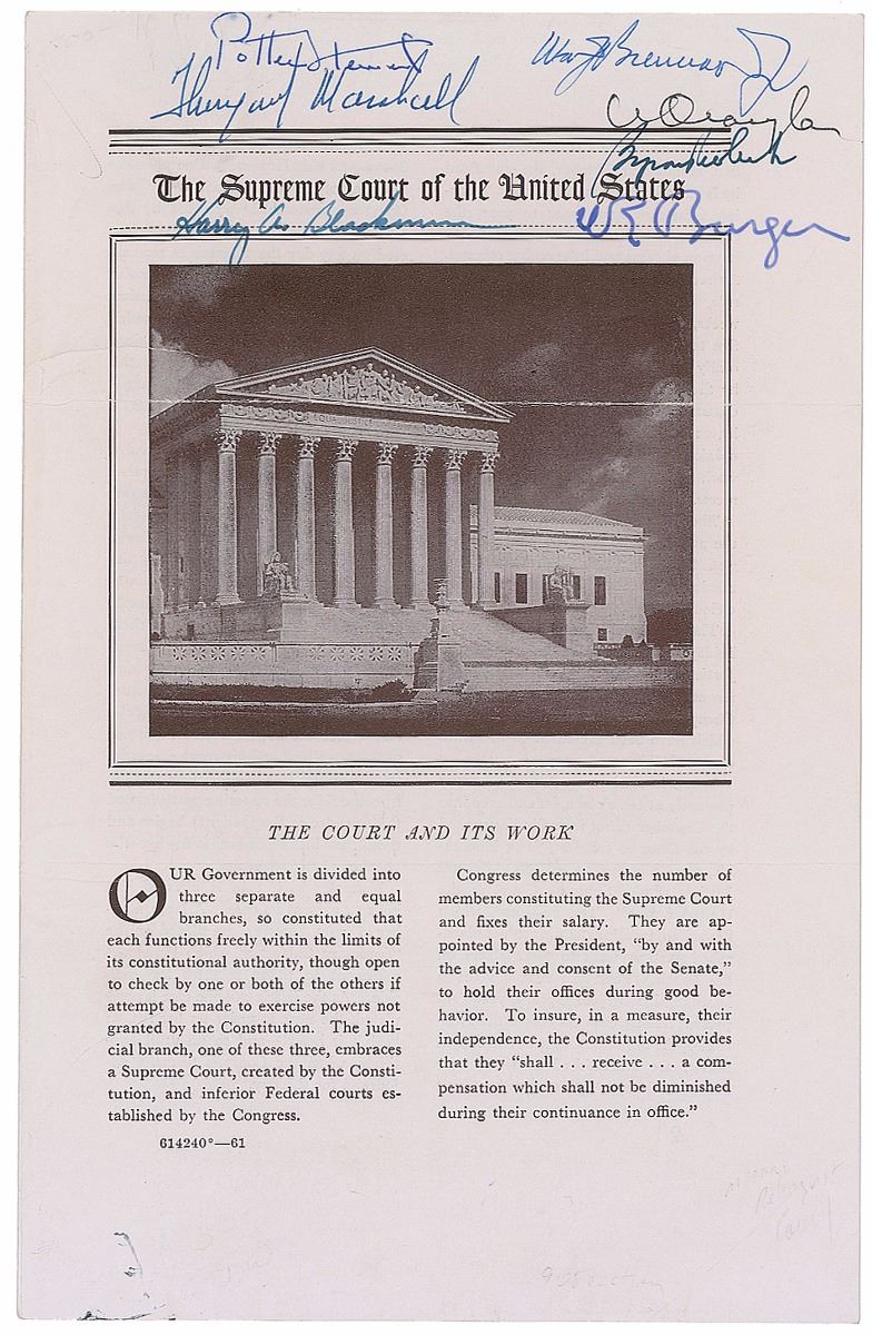 Three items: an ALS signed “Benjamin N. Cardozo,” August 12, 1936, in full: “Many thanks for the copy of your letter to the Law Journal. I begin to lose my faith in the reality of progress”; a printed pamphlet about the Supreme Court of the United States, eight pages, 6 x 9, signed on the front in ink, “Warren Burger,” “Potter Stewart,” “Thurgood Marshall,” “Harry A. Blackmun,” “William J. Brennan,” “William O. Douglas,” and “Byron White”; and an ADS from Roger B. Taney, signed “R. B. Taney, Attorney for the plaintiff,” no date but circa July 1804. Taney pens a legal document for the case of Ansley Stewart vs. John McLaine. In addition to the signature at the conclusion, Taney incorporates his name once in the main text, and again in an endorsement on the docketing panel. In overall very good to fine condition, some mirroring to ink on the Taney ADS, and staple holes to upper right of the Cardozo letter. Accompanied by an unsigned engraved portrait of Burger.