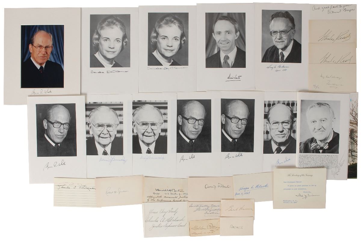 Collection of twenty-six items signed by various justices of the Supreme Court, consisting mostly of signed photos and cards, including: Warren E. Burger, Sandra Day O'Connor (2), Byron White (5), William J. Brennan, Jr. (2), Harry Blackmun, David Souter, John Paul Stevens (booklet), Stanley Forman Reed (2), Tom C. Clark, Charles Evans Whittaker, Hugo Black, Owen Roberts, Robert H. Jackson, Potter Stewart, Earl Warren, Harold Hitz Burton, James Clark McReynolds, Mahlon Pitney, and Fred M. Vinson (treasury card). In overall fine condition.