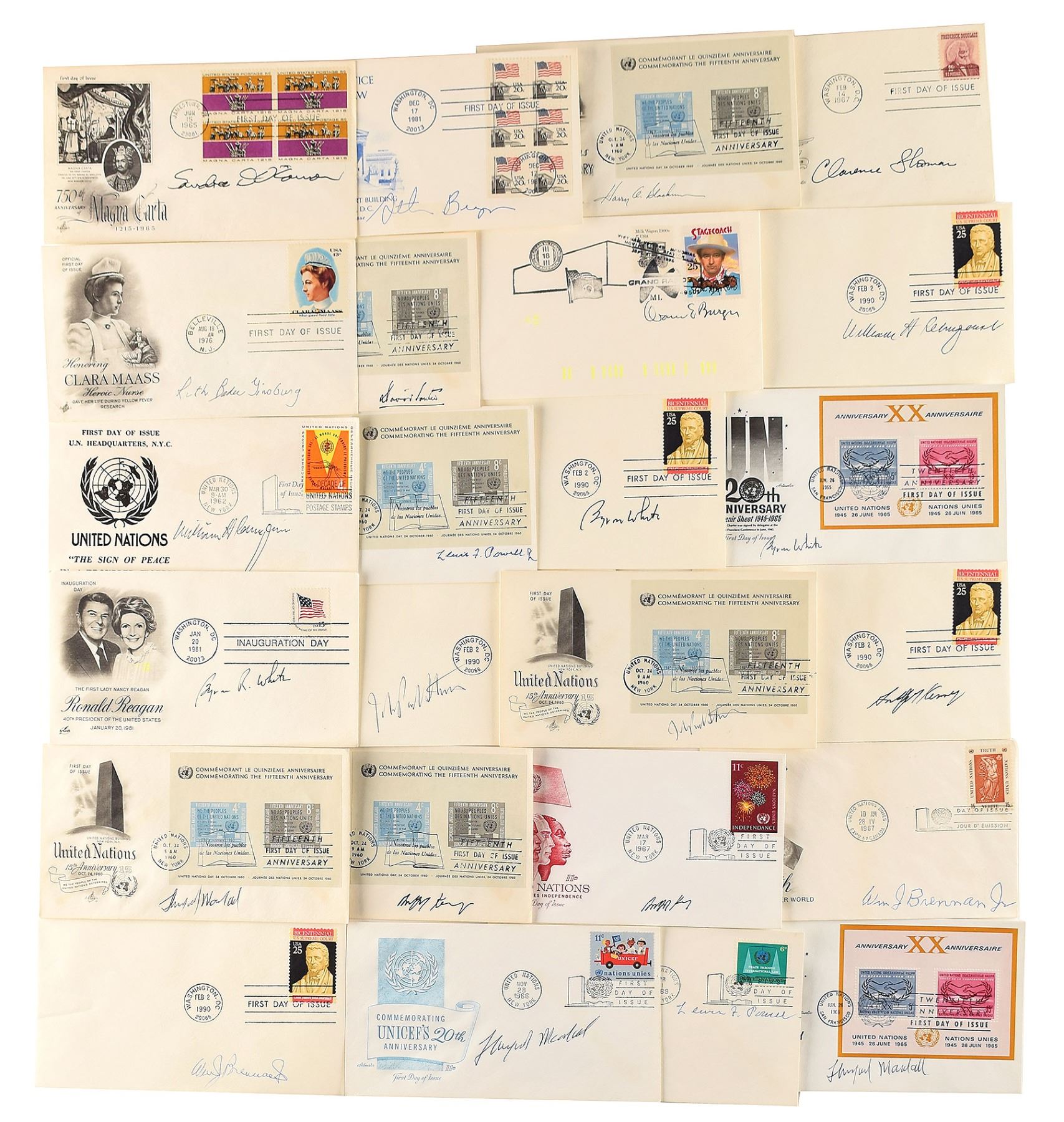 Collection of 24 FDCs signed in ballpoint or ink by a justice of the Supreme Court, including: Harry Blackmun, William J. Brennan, Jr. (2), Stephen Breyer, Warren E. Burger, Ruth Bader Ginsburg, Anthony Kennedy (3), Thurgood Marshall (3), Sandra Day O'Connor, Lewis F. Powell, Jr. (2), William Rehnquist (2), David Souter, John Paul Stevens (2), Clarence Thomas, and Byron White (3). In overall fine condition.