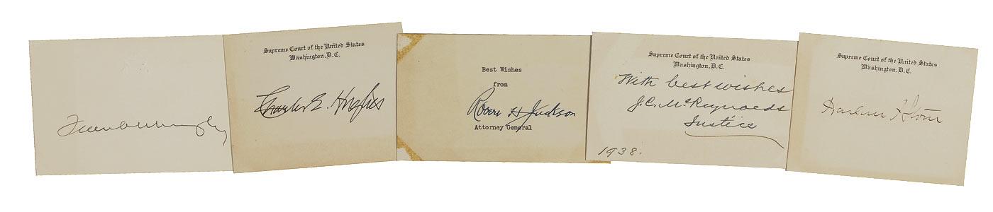 Vintage fountain pen signatures of Charles Evans Hughes, Louis Brandeis, J. C. McReynolds, Hugo Black, Harlan F. Stone, Owen Roberts, and Benjamin Cardozo on individual 5.5 x 2.75 blue cards from the Albert R. Chestnut collection. All have small clipped photos of the respective signer affixed to their card, with some cards affixed to heavier gray or black cards. In fine condition, with punch holes to left edge of each card, and a bit of light toning. RRAuction COA.