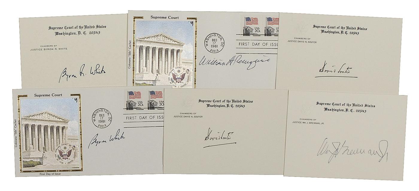 Six items: ink signatures of William J. Brennan, David Souter (2), and Byron White; and two FDCs, each bearing a color silk cachet honoring the Supreme Court, signed in ink by Byron White and William Rehnquist respectively. In fine condition. RRAuction COA.