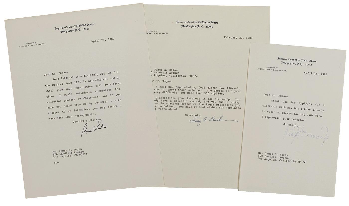 Three TLSs, two 8.5 x 11 and one 6 x 9, dating from 1983–84, all on Supreme Court letterhead, each signed at the conclusion by a different Justice: William J. Brennan, Byron White, and Harry Blackmun. In fine condition. RRAuction COA.