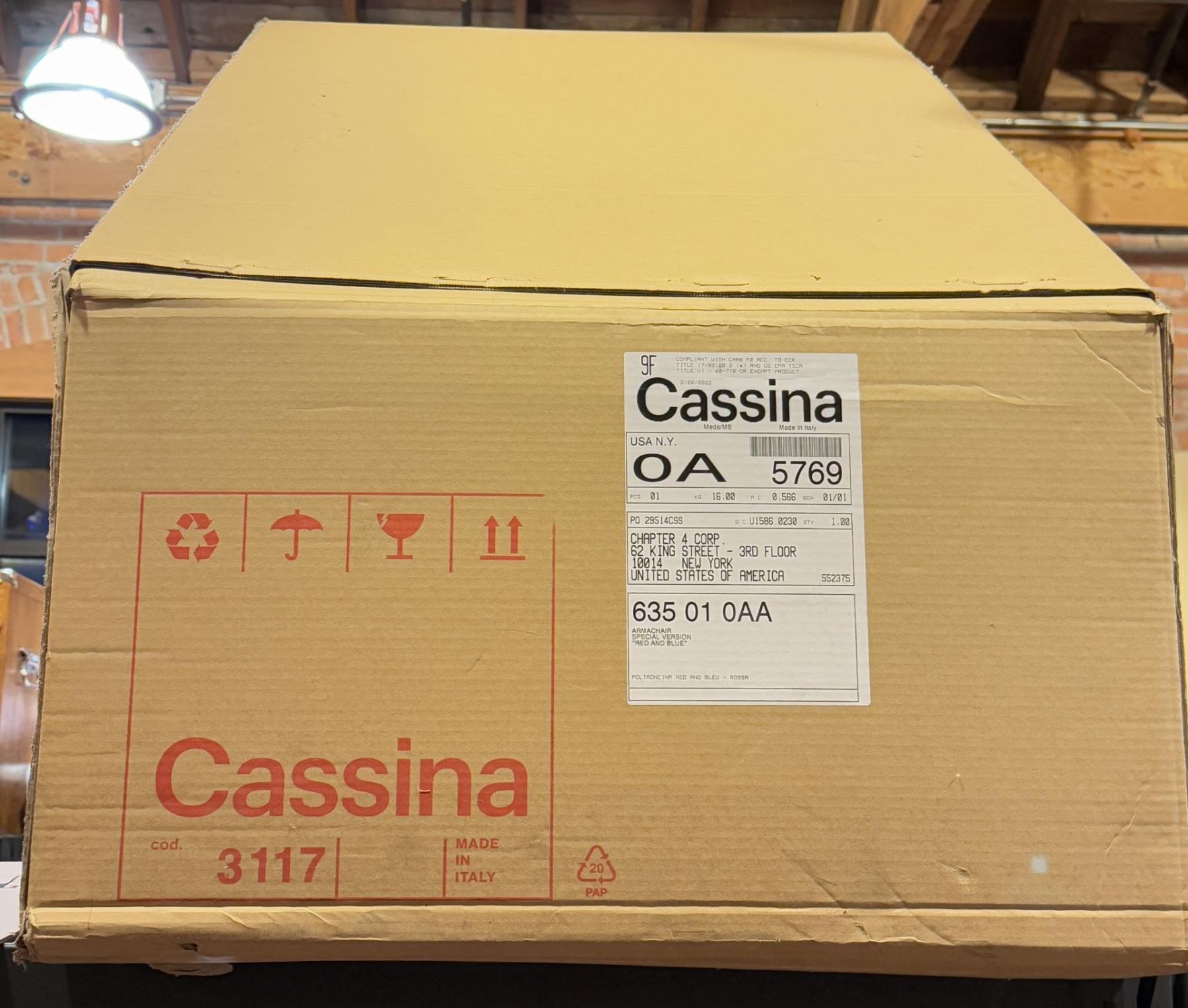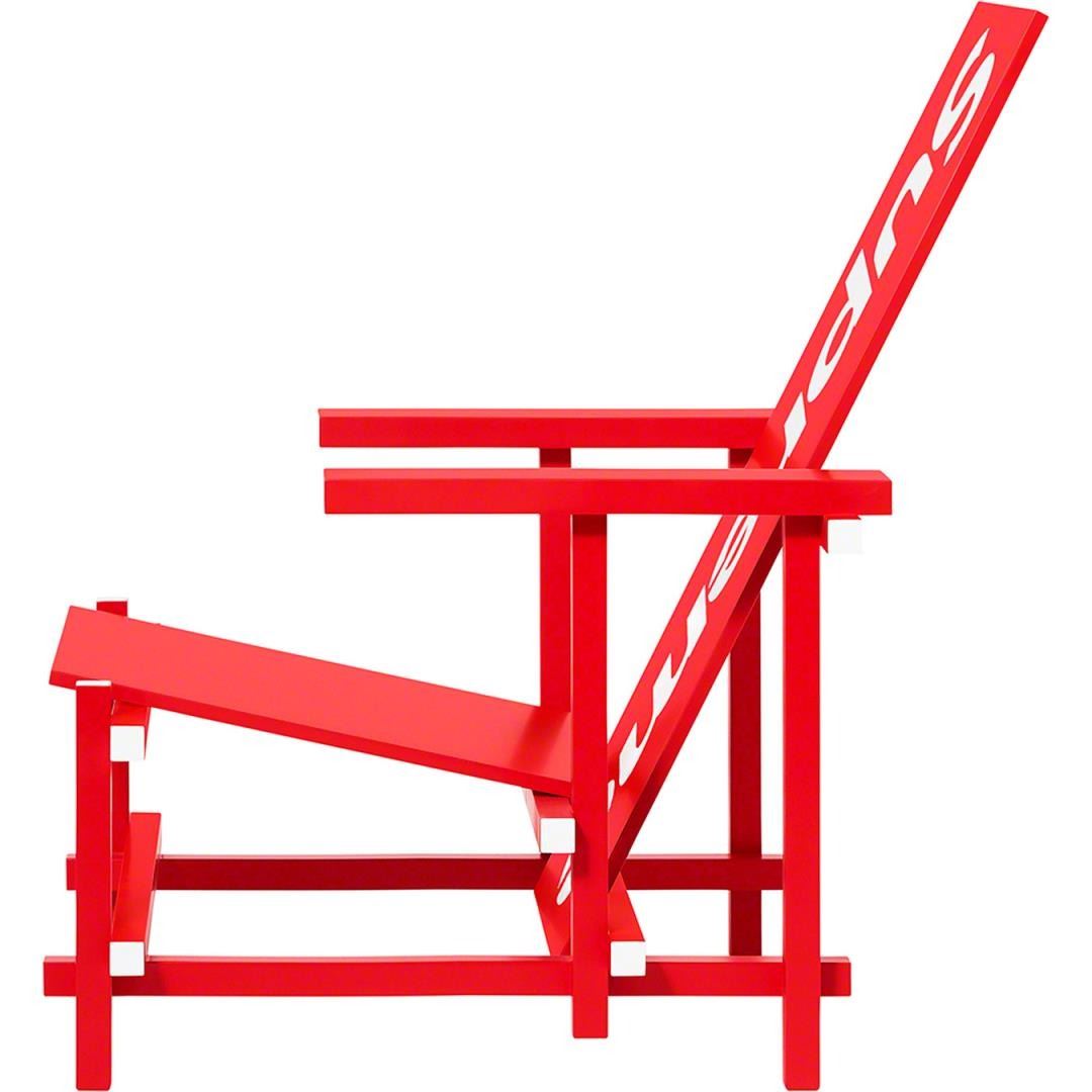 New in original box. Quite rare, made to order. Birch plywood seat and backrest with beech veneered edges and tops. Printed logo and custom red lacquer finishing. 32.7" x 27.3" x 37.4" with 13.1" seat height. Original model designed by Gerrit T. Rietveld in 1918 and reissued by Cassina since 1973. Made exclusively for Supreme.