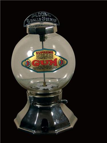 Supreme Gumball Machine, 6 balls for 3 cents. R.D. Simpson Co. with locks and keys. Professionally restored. 13 1/2 inches tall.