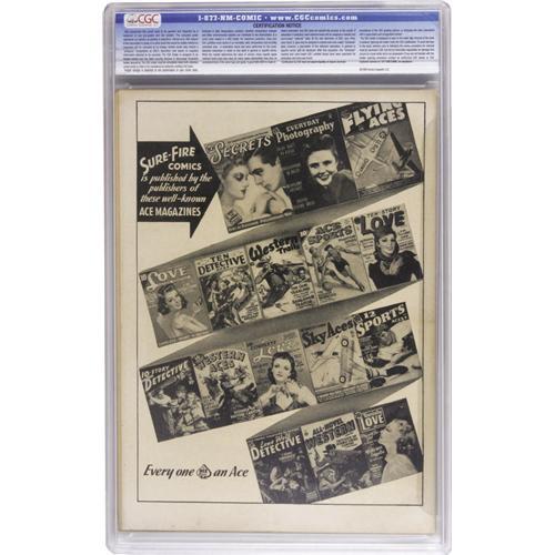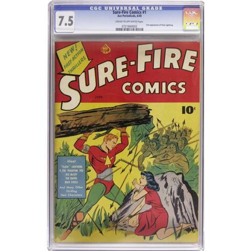 <B>Sure-Fire Comics #1 (Ace, 1940) CGC VF- 7.5 Cream to off-white pages.</B></I> This is the very first comic book published by Ace Periodicals, a prolific publisher for the ensuing 15 years or so. The cover went to Flash Lightning (later <I>Lash</B></I> Lightning), and the issue also has the debuts of great names like X the Phantom Fed, Marvo the Magician (and Tito), "Hap" Hazard... wasn't the Golden Age great? Overstreet 2006 VF 8.0 value = $1,113. CGC census 9/06: 2 in 7.5, none higher.<BR><BR><b>Shipping:</b> Slabbed Comic (<a target="_blank" href="http://www.heritageauctions.com/common/shipping.php">view shipping information</a>)