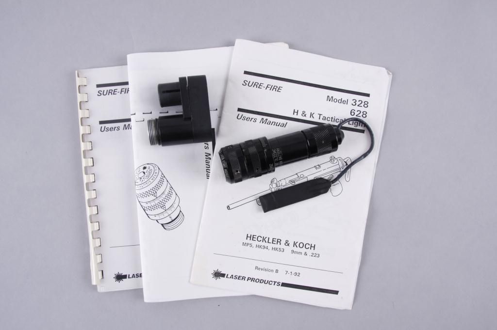 Sure Fire L70 LaserLaser light with padded plastic case, pressure pad activated. Includes 2 copies of the manual (one bound and one photo copy), 2 spare adhesive backed Mylar windows, an unidentified mount and a manual for an H&Ktactical light.