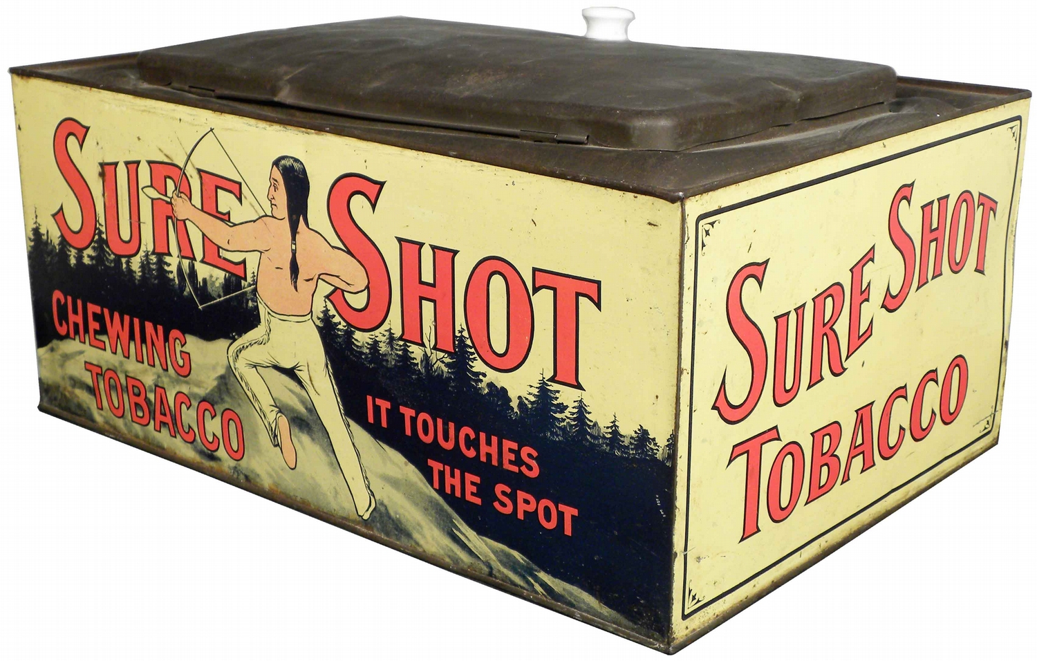 Sure Shot Chewing Tobacco Tin Store Bin. A few paint rubs and dents otherwise good condition. 15 X 7 X 10 inches.