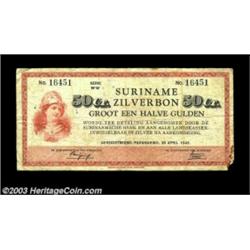 <TABLE cellSpacing=0 cellPadding=0 width="100%" bgColor=#000000 border=0><TBODY> <TR><TD width="100%"><TABLE cellSpacing=1 cellPadding=3 width="100%" border=0><TBODY><TR><TD width="100%" bgColor=#79735c><FONT face=arial color=#ffffff size=3><B>Description</B> </FONT></TD></TR><TR><TD width="100%" bgColor=#ffffff><FONT face=arial size=2><B>Surinam</B></I> 50 cent Apr. 30, 1942 Pick 17c Very Good; 1 gulden July 1, 1941 Pick 18b Fine; 1 gulden Apr. 30, 1942 Pick 18c Fine-Very Fine<BR>(3 notes) </FONT></TD></TR></TBODY></TABLE></TD></TR></TBODY></TABLE><BR><A name=PricesRealized></A><TABLE cellSpacing=0 cellPadding=0 width="100%" bgColor=#000000 border=0><TBODY><TR><TD width="100%"><TABLE cellSpacing=1 cellPadding=3 width="100%" border=0><TBODY><TR><TD width="100%" bgColor=#79735c><A name=PR><FONT face=arial color=#ffffff size=3><B>Previous Prices from Heritage Auctions</B> </FONT></A></TD></TR><TR><TD bgColor=#f6f6ed>No Prior Data Recorded </TD></TR><TR><TD bgColor=#ffffff><FONT face=arial size=1 ?>PLEASE NOTE: All prices realized reflect the final hammer price PLUS the buyer's premium in auctions that charge a buyer's premium. Each item has a notation at the top of the listing indicating whether that lot included a buyer's premium. Example: A item that sells with a final hammer price of $100 and a 20% buyer's premium will display with a price realized of $120. All information listed is intended to be as accurate as possible, but errors are possible. Please use this guide carefully and inform us of any inaccuracies. </FONT></TD></TR></TBODY></TABLE></TD></TR></TBODY></TABLE><BR><TABLE cellSpacing=0 cellPadding=0 width="100%" bgColor=#000000 border=0><TBODY><TR><TD width="100%"><TABLE cellSpacing=1 cellPadding=3 width="100%" border=0><TBODY><TR><TD width="100%" bgColor=#79735c colSpan=6><FONT face=arial color=#ffffff size=3><B>Price Guide*</B> </FONT></TD></TR><TR bgColor=#f6f6ed><TD align=middle><B>Grade</B> </TD><TD align=middle><B>Coin World<BR>(Trends)</B> </TD><TD align=middle><B>Numismedia<BR>Retail</B> </TD><TD align=middle><B>Numismedia<BR>Wholesale</B> </TD><TD align=middle><B>Coin<BR>Universe</B> </TD><TD align=middle><B>Heritage<BR>Value Index</B> </TD></TR><TR><TD colSpan=6>No Pricing Data Available</TD></TR><TR bgColor=#ffffff><TD colSpan=6><FONT size=1>*All information listed is intended to be as accurate as possible, but errors are possible. No item may be returned or refused based on this information which is provided as a service to our customers. You should contact each pricing source directly to determine the accuracy of this information. </FONT></TD></TR></TBODY></TABLE></TD></TR></TBODY></TABLE><BR><TABLE cellSpacing=0 cellPadding=0 width="100%" bgColor=#000000 border=0><TBODY><TR><TD width="100%"><TABLE cellSpacing=1 cellPadding=3 width="100%" border=0><TBODY><TR><TD width="100%" bgColor=#79735c><FONT face=arial color=#ffffff size=3><B>Population Guide</B> </FONT></TD></TR><TR bgColor=#ffffff><TD ali Important notice: Heritage usually auctions material at the rate of 200-250 lots per hour. On some occasions eBay Live bid software or the Internet may not be able to keep up with the pace of the auction. We recommend placing a realistic absentee bid now as insurance to avoid disappointment. Occasionally the auctioneer may eliminate or reject an eBay Live bid, and the auctioneer may also reopen a lot after the close of the eBay live bidding (usually because we missed an audience bid), and may reject your bid even if it shows you as the winning bidder. By bidding via eBay Live, you agree that Heritage may award the lot to another bidder at its sole discretion under the circumstances described above or any other reasonable circumstances. Also please note that all Heritage lots purchased through eBay Live carry a 20% Buyer's Premium. Please make sure you read the Terms and Conditions before you bid.</TD></TR></TBODY></TABLE></TD></TR></TBODY></TABLE>