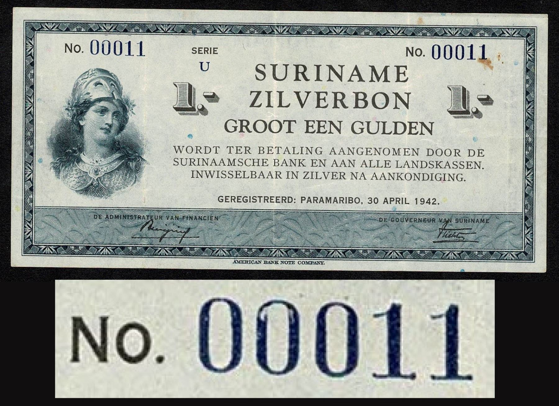 Suriname 1 Gulden 1942 Low and fancy serial number 00011! ABNC 30.04.1942 Pick 105c