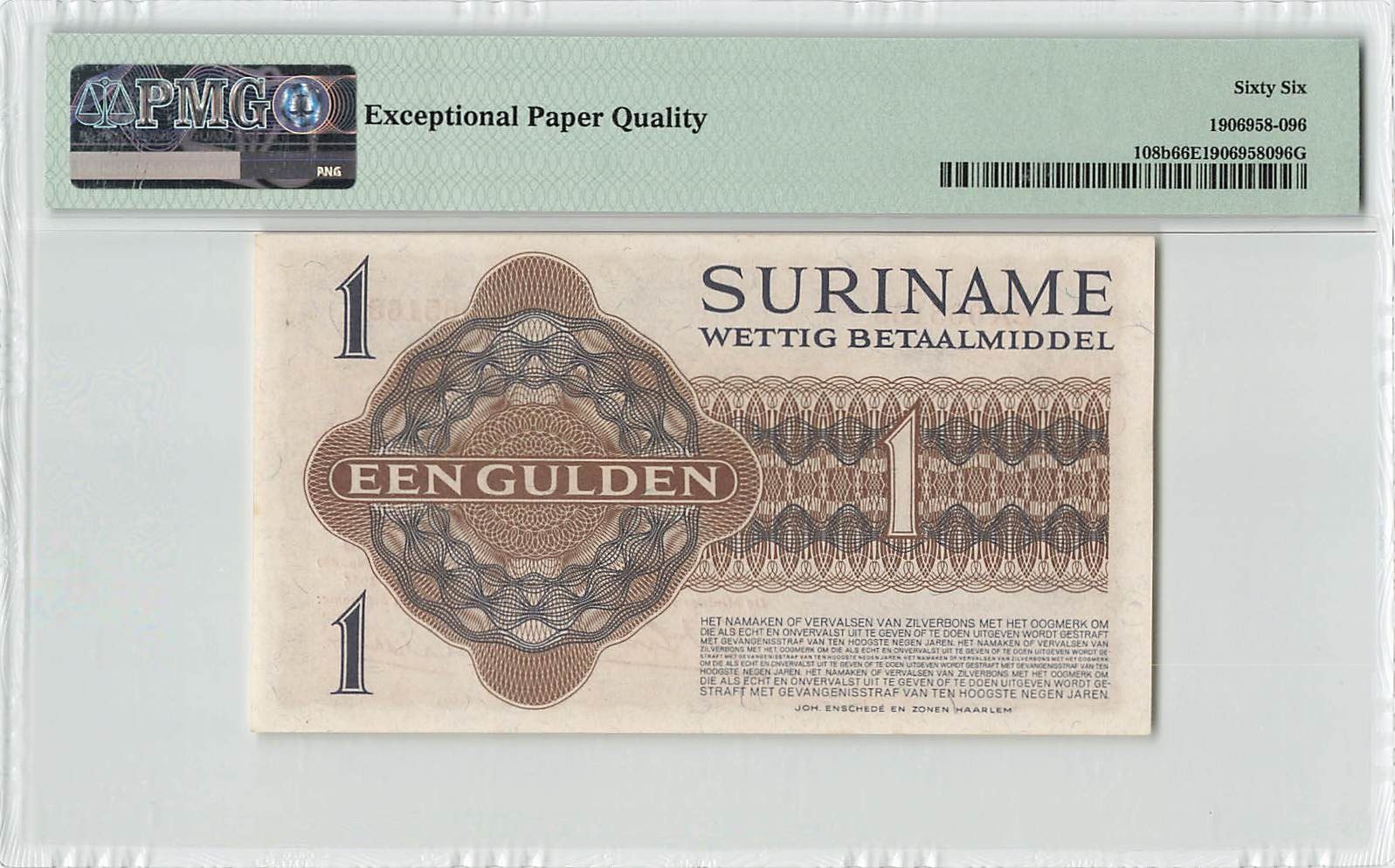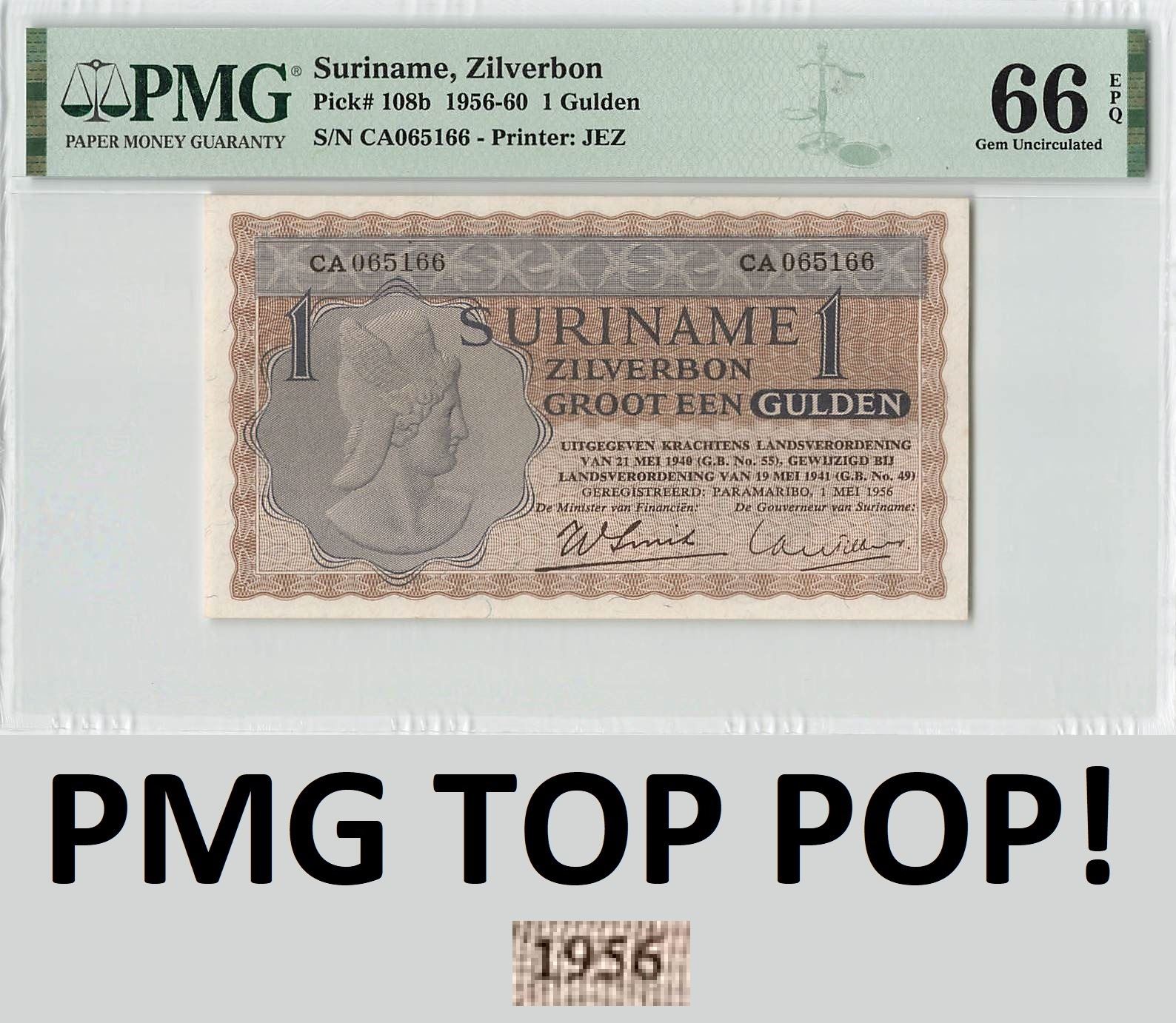 Suriname 1 Gulden 1956 Rare Year! JEZ Pick 108b PMG Gem Uncirculated 66 EPQ TOP POP
