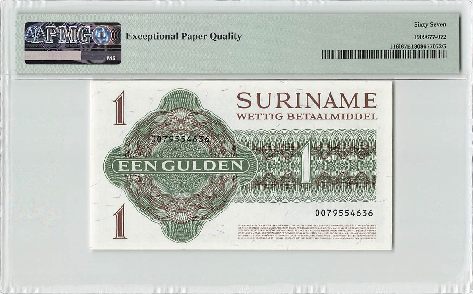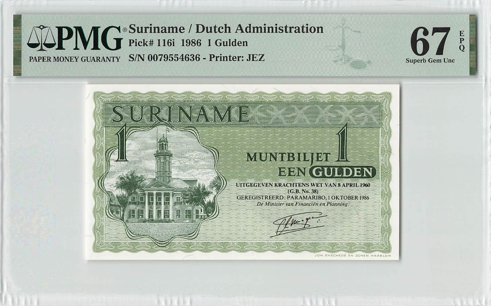 Suriname 1 Gulden 1986 State Note Pick 116i PMG Superb Gem UNC 67 EPQ