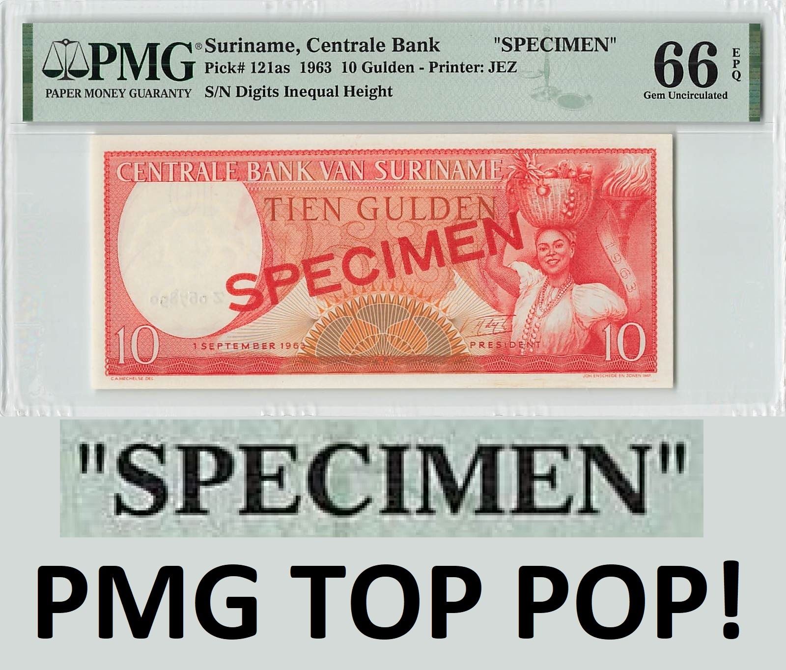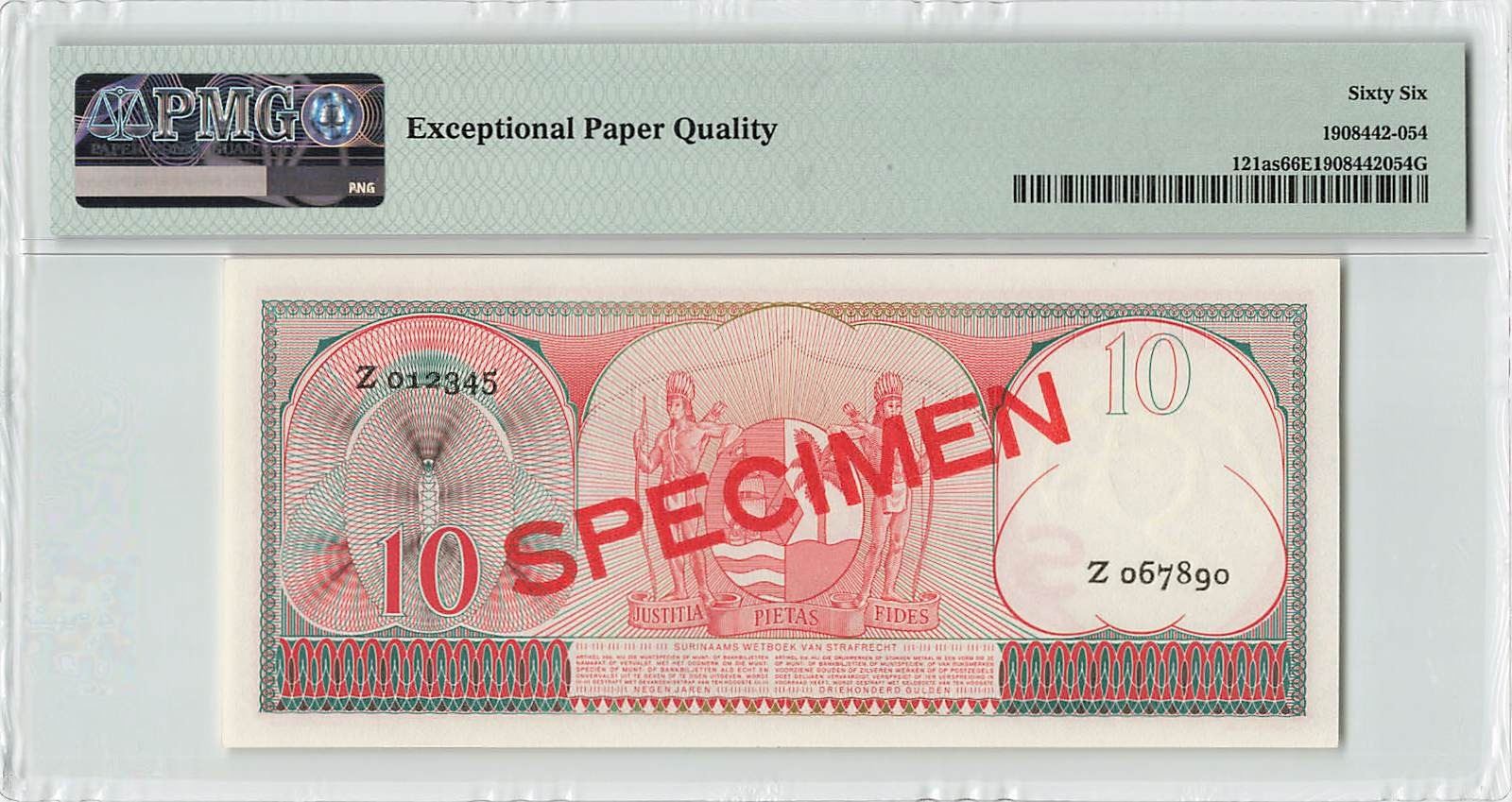 Suriname 10 Gulden 1963 Specimen JEZ Pick 121as PMG Gem Uncirculated 66 EPQ