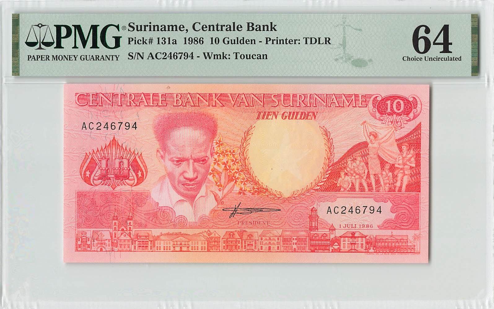 Suriname 10 Gulden 1986 TDLR Pick 131a PMG Choice Uncirculated 64