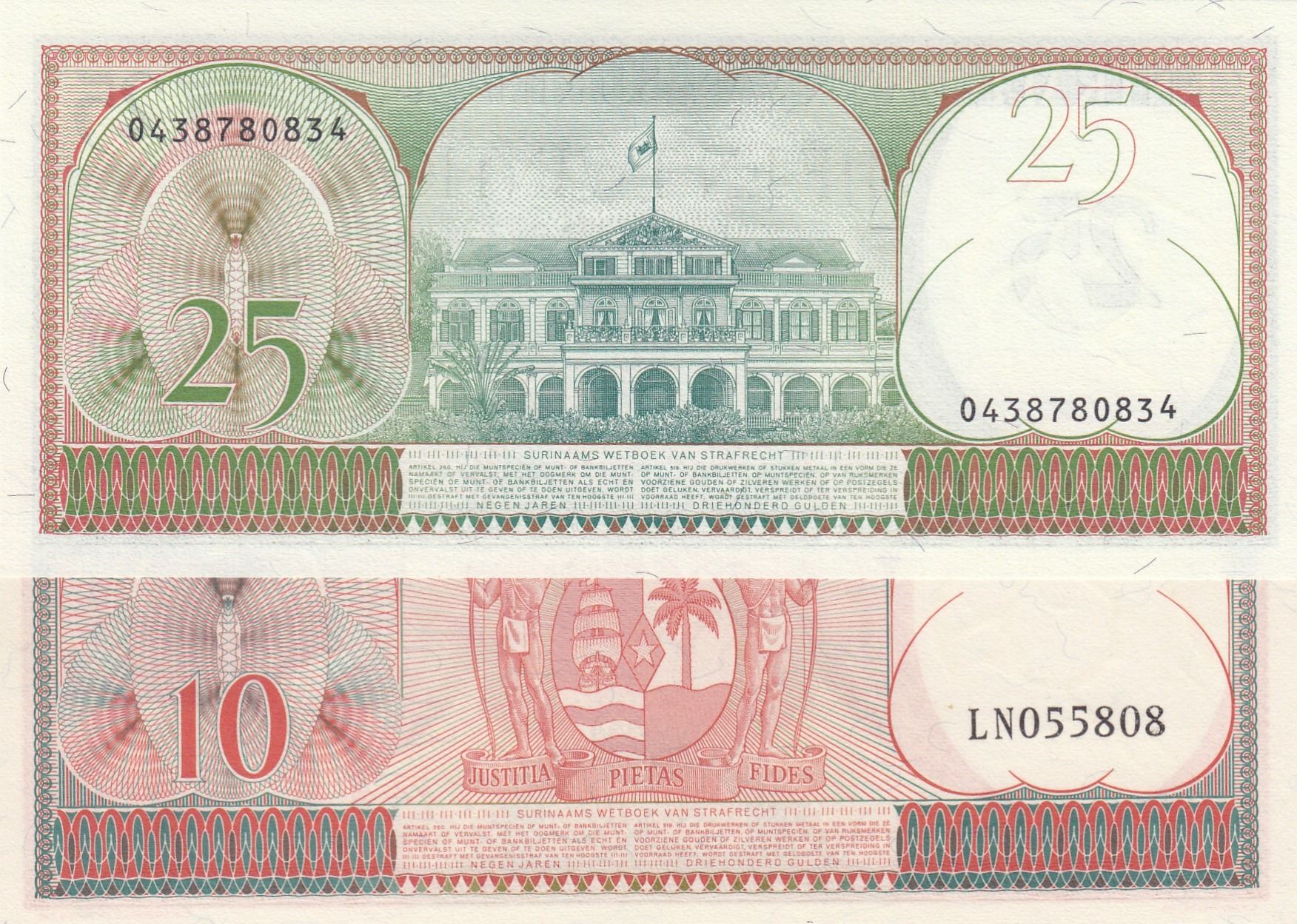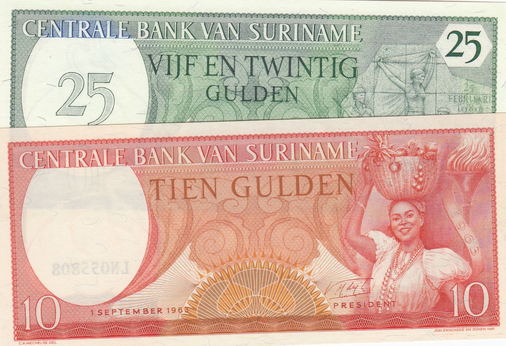Suriname, 10 Gulden and 25 Gulden, 1963/1985, UNC, p121, p127, (Total 2 banknotes)br/