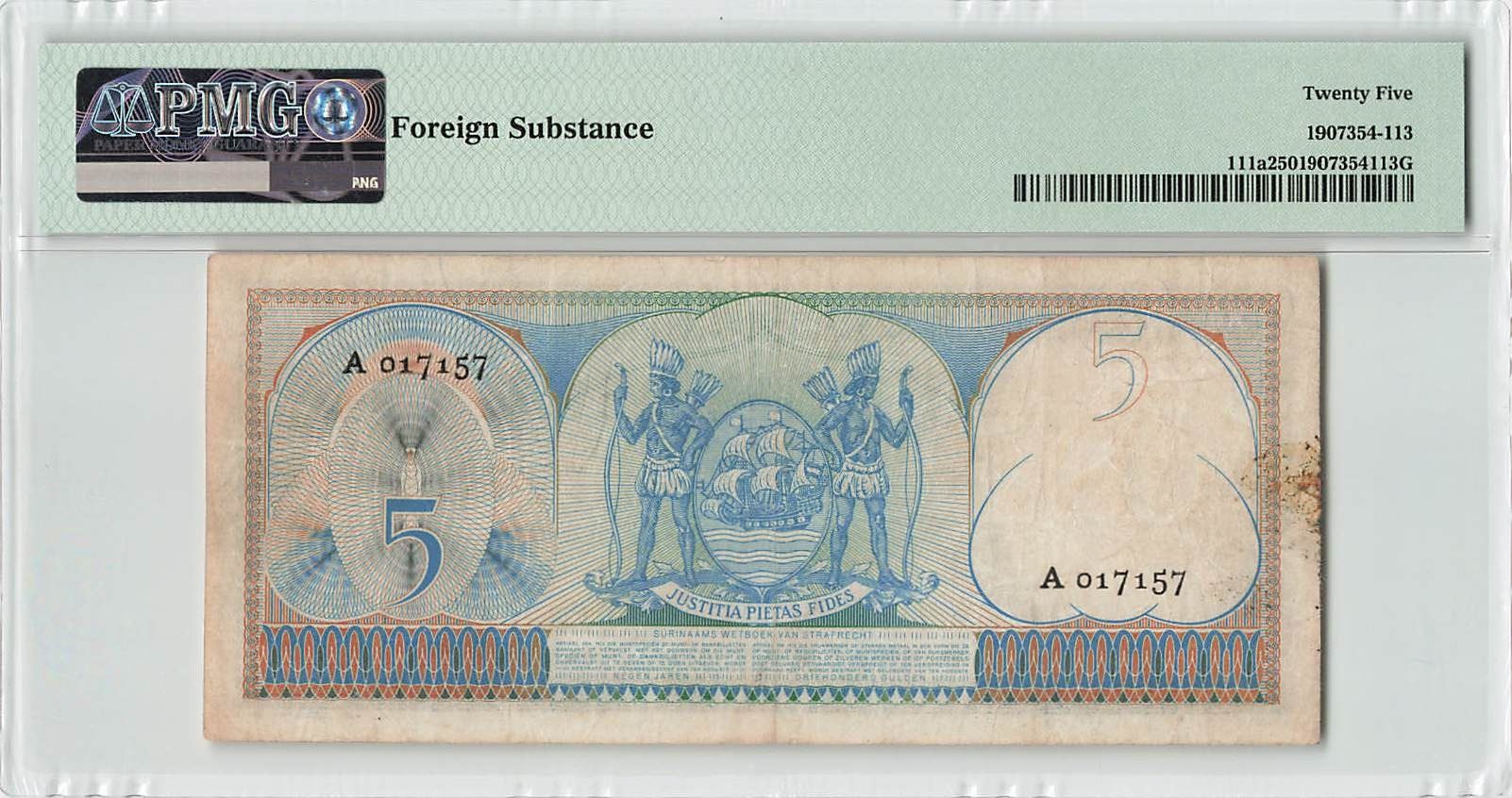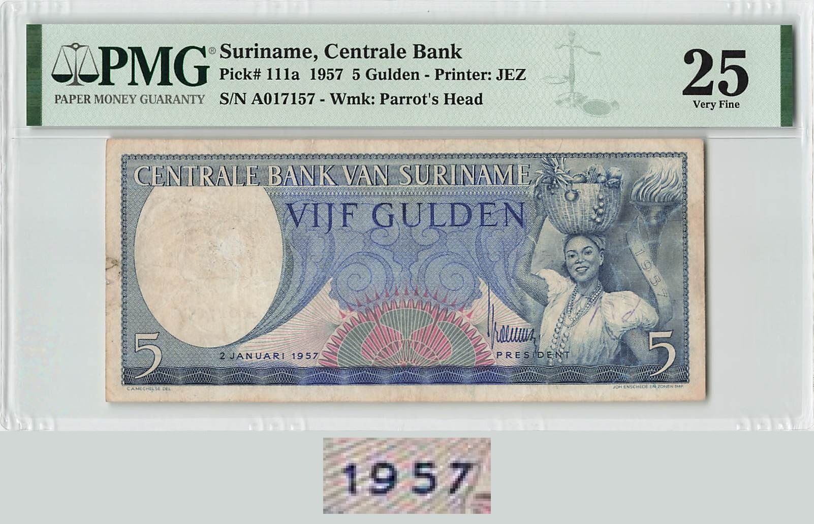 Suriname 5 Gulden 1957 JEZ Pick 111a PMG Very Fine 25