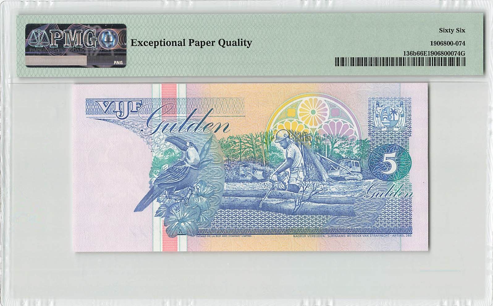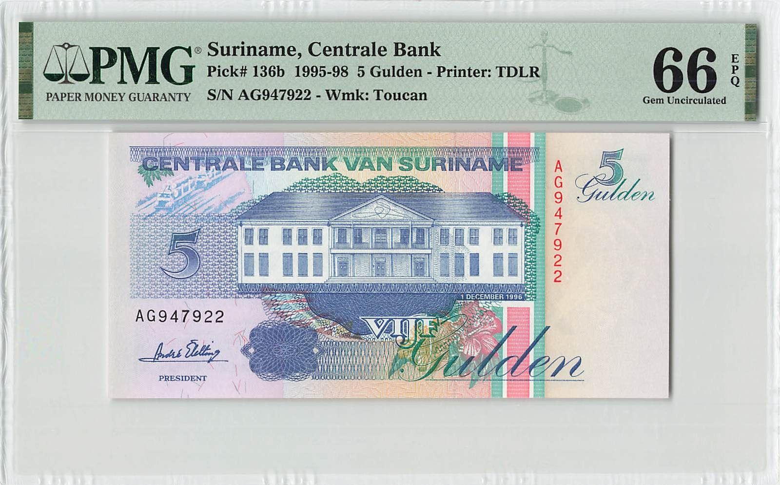 Suriname 5 Gulden 1996 TDLR Pick 136b PMG Gem Uncirculated 66 EPQ