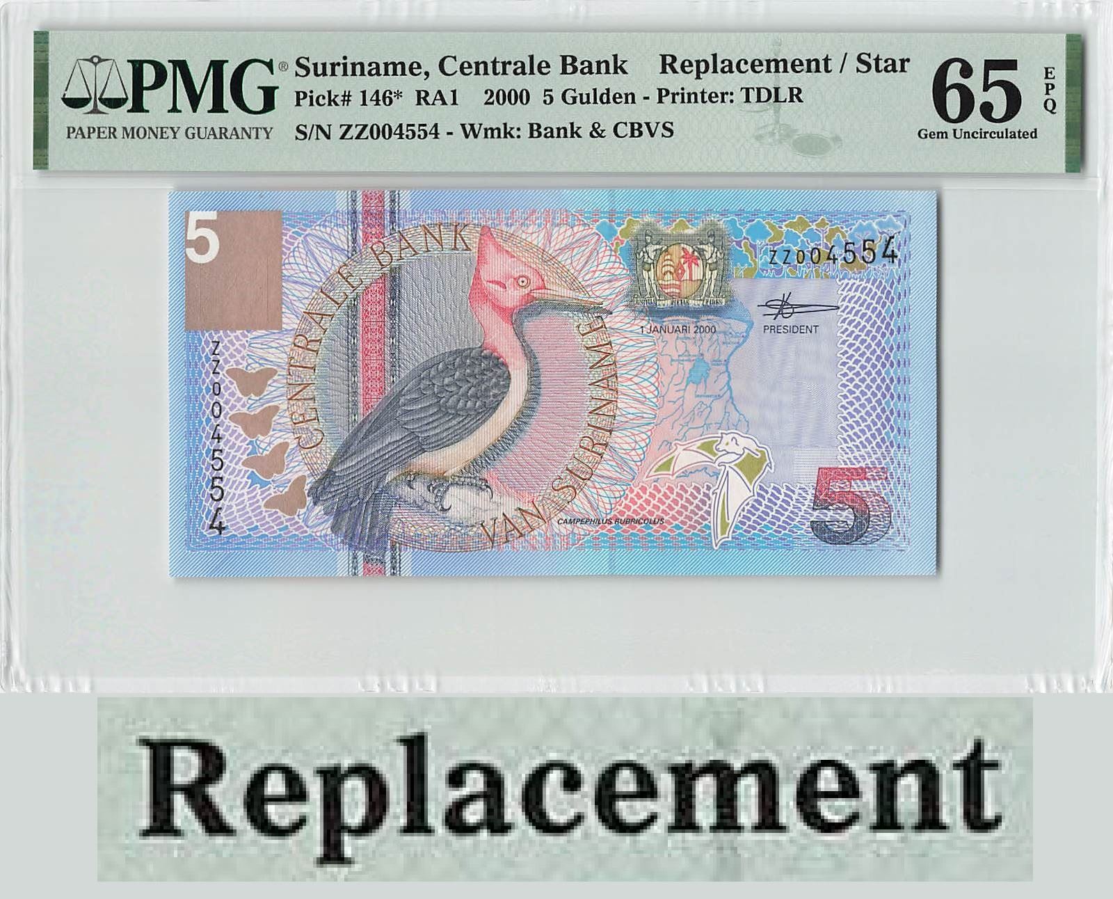 Suriname 5 Gulden 2000 Replacement TDLR Pick 146 PMG Gem UNC 65 EPQ