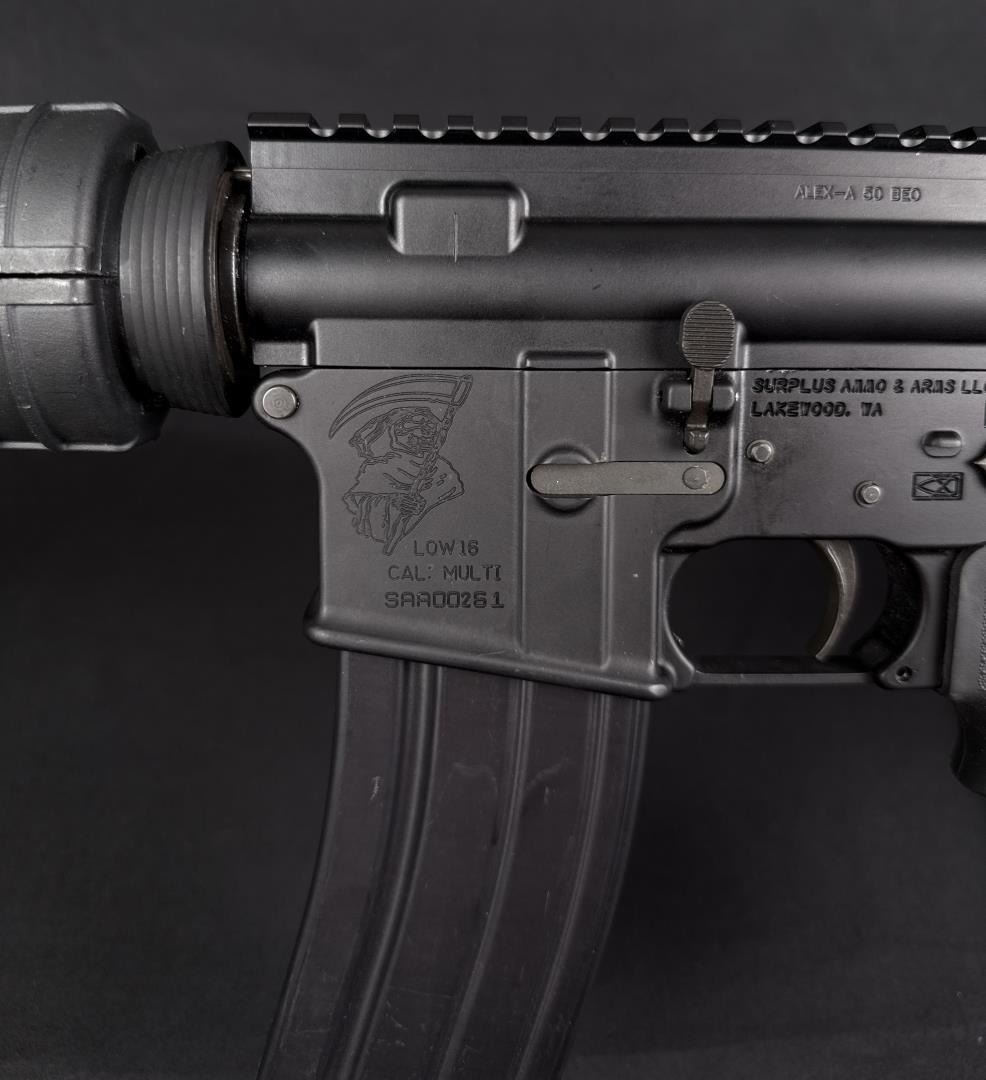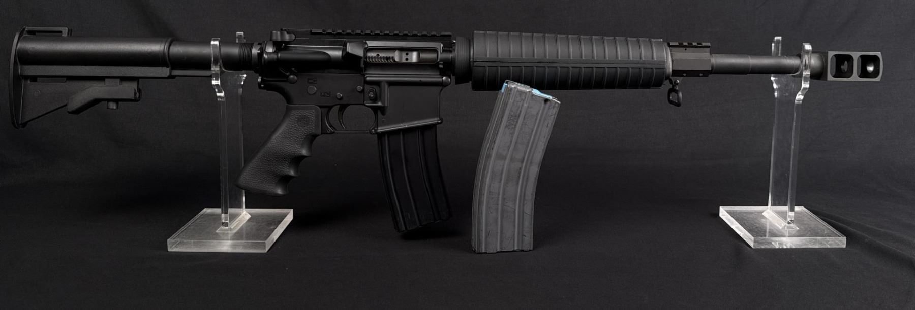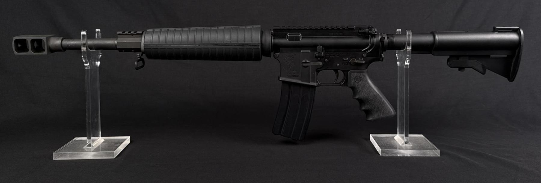 Alexander Arms barreled upper receiver w/ threaded barrel, terminated w/ 4 chamber muzzle brake. Low profile gas block. Mid-length round handguards. Flat top upper receiver. Round forward assist & brass deflector. Surplus Ammo & Arms Model LOW 16 lower receiver. 4 position collapsible black plastic shoulder stock. Black rubber Hogue pistol grip. Sling swivels, front & rear. 18" barrel. Requires FFL Transfer, C&R not accepted. No sales to the following areas, a bid from any of these restricted areas will result in immediate termination of your agility to place bids with our auction company in perpetuity: California, Colorado, Connecticut, Delaware, Washington DC, Illinois, Hawaii, Maryland, Massachusetts, Washington State, New Jersey, Vermont, and New York.