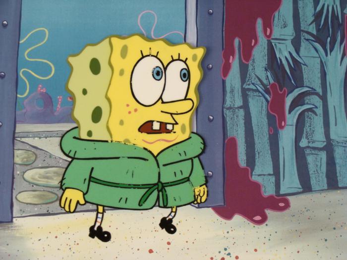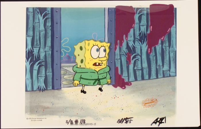 This animation cel and reproduction background are from the Nickelodeon TV show SpongeBob Squarepants. The story takes place under the deep blue sea in Bikini Bottom, where SpongeBob resides. SpongeBob, who is a yellow, porous sponge, is your typical happy-go-lucky character, as he is always cheerful and enjoys making people laugh. Patrick Star, SpongeBob's neighbor who is a starfish, is your average children's show idiot, as he boasts knowing nothing and is often getting himself into ridiculous situations. Between the homes of these two lies the home of the miserable Squidward, a squid, who is known for being grouchy and playing tricks on SpongeBob and Patrick. Both SpongeBob and Squidward work at the Krusty Krab, a fast food business run by the greedy money-loving Mr. Krabs, a crab, the arch rival of the evil, possibly misunderstood, Plankton. Another neighbor, Sandy Cheeks, an athletic squirrel who normally wears an astronaut's space suit, was introduced in "Tea at the Treedome." She spends most of her time inventing and experimenting. SpongeBob is surprised to see jelly all over his house.Original Printed Background and Animated Cel Overall Size of Background: 11" x 17" Overall Size of the Cel: 10 1/2" x 12 1/2" Very good condition This is an original hand-painted cel set-up used in the production of an episode of "SpongeBob SquarePants." Each one-of-a-kind set-up represents a slight change in position of the characters. When individually photographed and projected in rapid succession, the images appear to move.