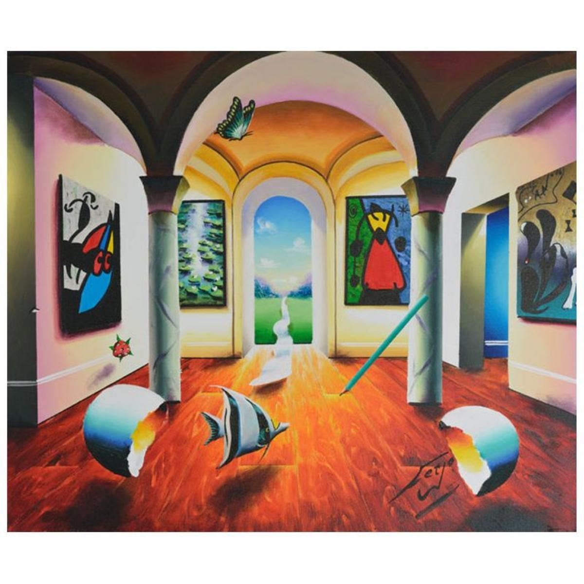 "Surrealistic Interior" is an original painting, oil on stretched canvas, by Ferjo. Hand signed by the artist, this piece comes with a letter of authenticity. Measures approx. 20" x 24" (image).