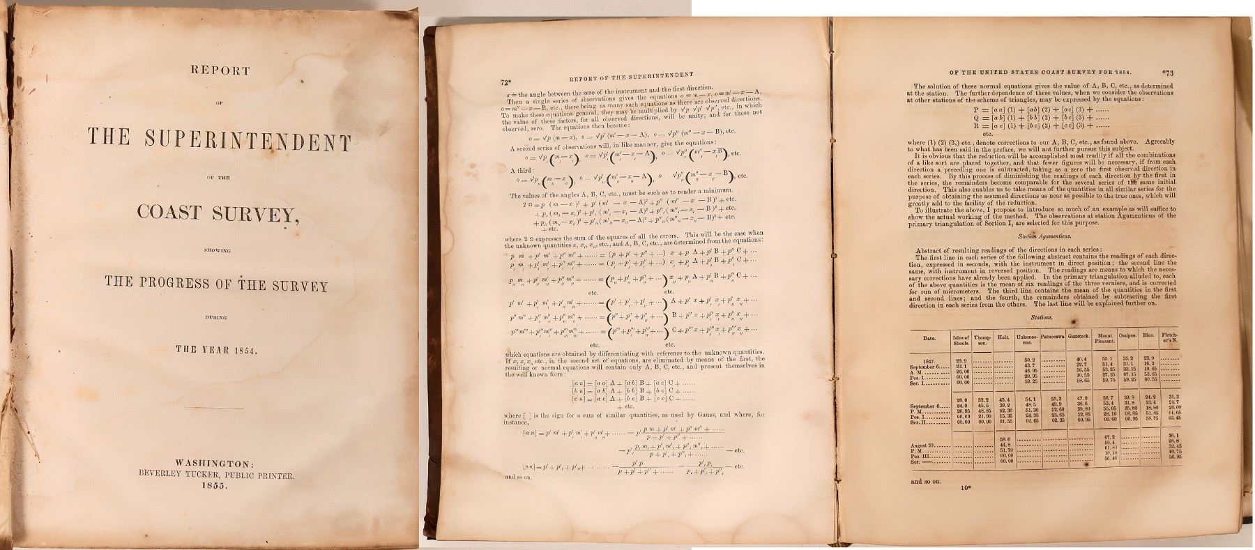 This is a rare) Report of the Superintendent of the Coast Survey : Showing the Progress of the Survey During the Year 1854. Washington:Beverly Tucker, Public Printer, 1855. William H. Bissell autograph in front cover. Humboldt Bay coming out Shasta. West Coast observations; moon, tides, islands. Binding poor. Maps incomplete. See photos for more detail.