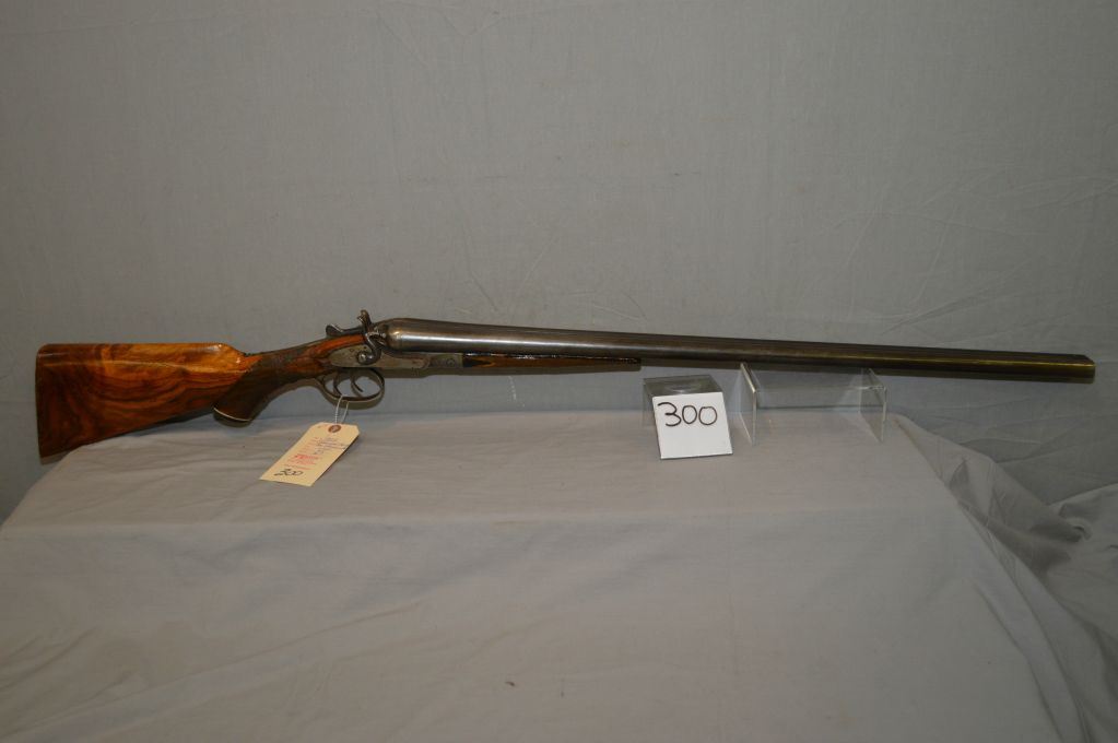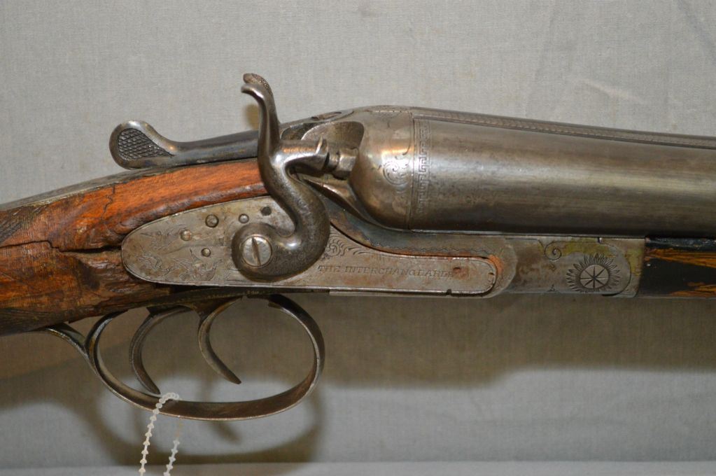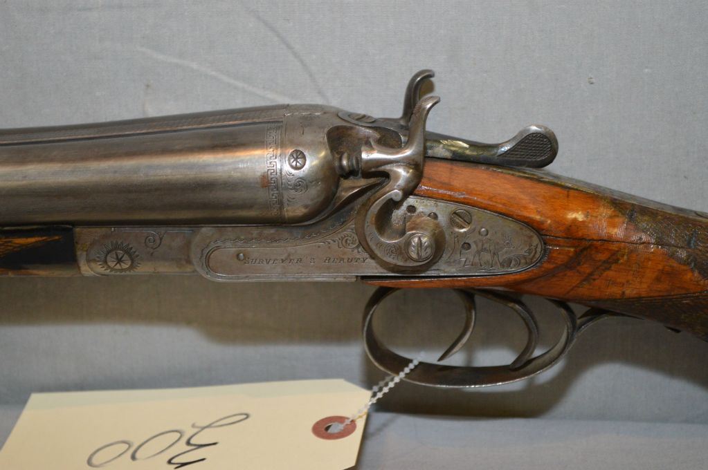 Surveyer's Beauty Model The Interchangeable .12 Ga Side By Side Hammer Shotgun w/ 30" bbls [ fading blue finish, stock broken & glued with large chip missing, also upper tang welded, missing the butt plate, forend tip appears wood filled ] Ser # 328