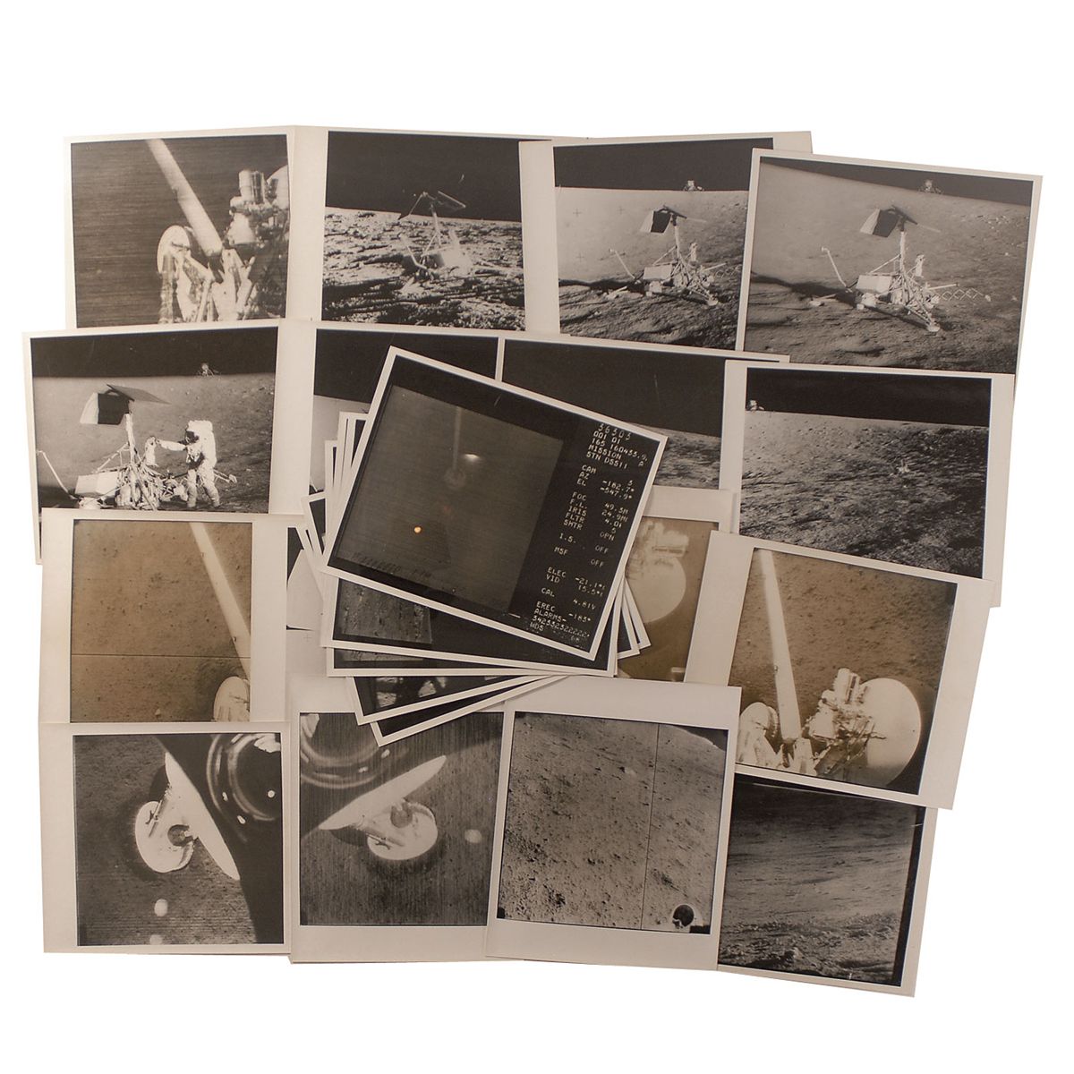 Collection of 27 original glossy photos, all 10 x 8, taken by Surveyor 3 or by Apollo 12 moonwalkers Charles Conrad and Alan Bean. Ten of the photos show the unmanned lander on the lunar surface, the Apollo 12 lunar module visible in the background of a couple of the shots, and Conrad standing next to the lander. Other photos were taken by Surveyor 3 showing parts of its body or the lunar surface, with some photos also showing transmitted date. In overall fine condition.