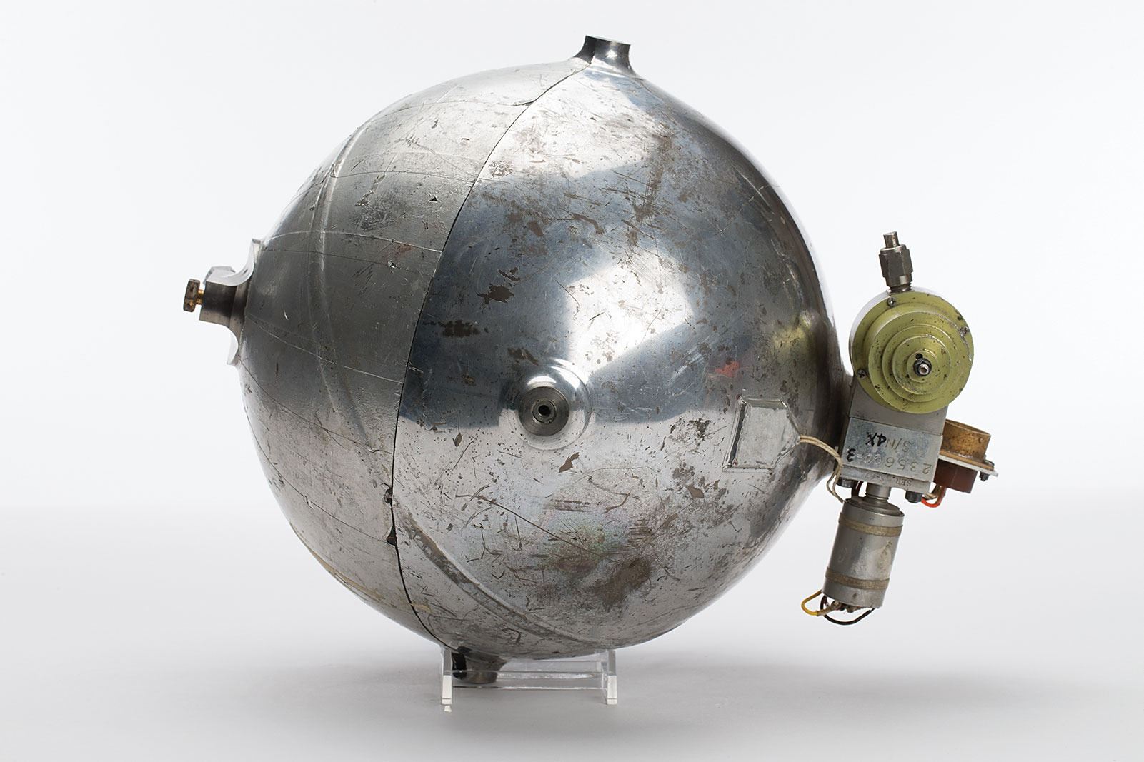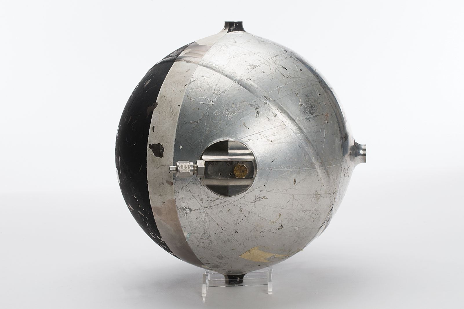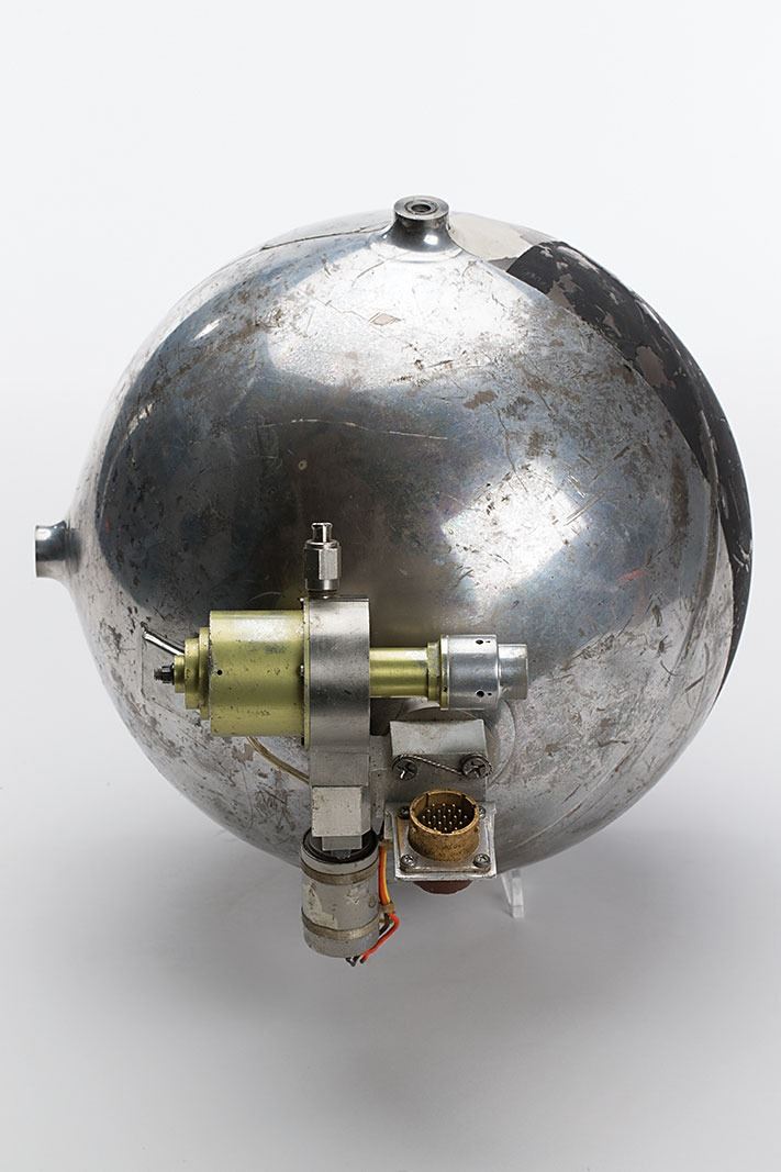 Very rare JPL Surveyor Lunar Lander Propellant Pressurization Tank for the RCS System, measuring 9? in diameter with valves on one side, engraved on the valve, "235600-3, S/N 4X." In very good to fine condition.