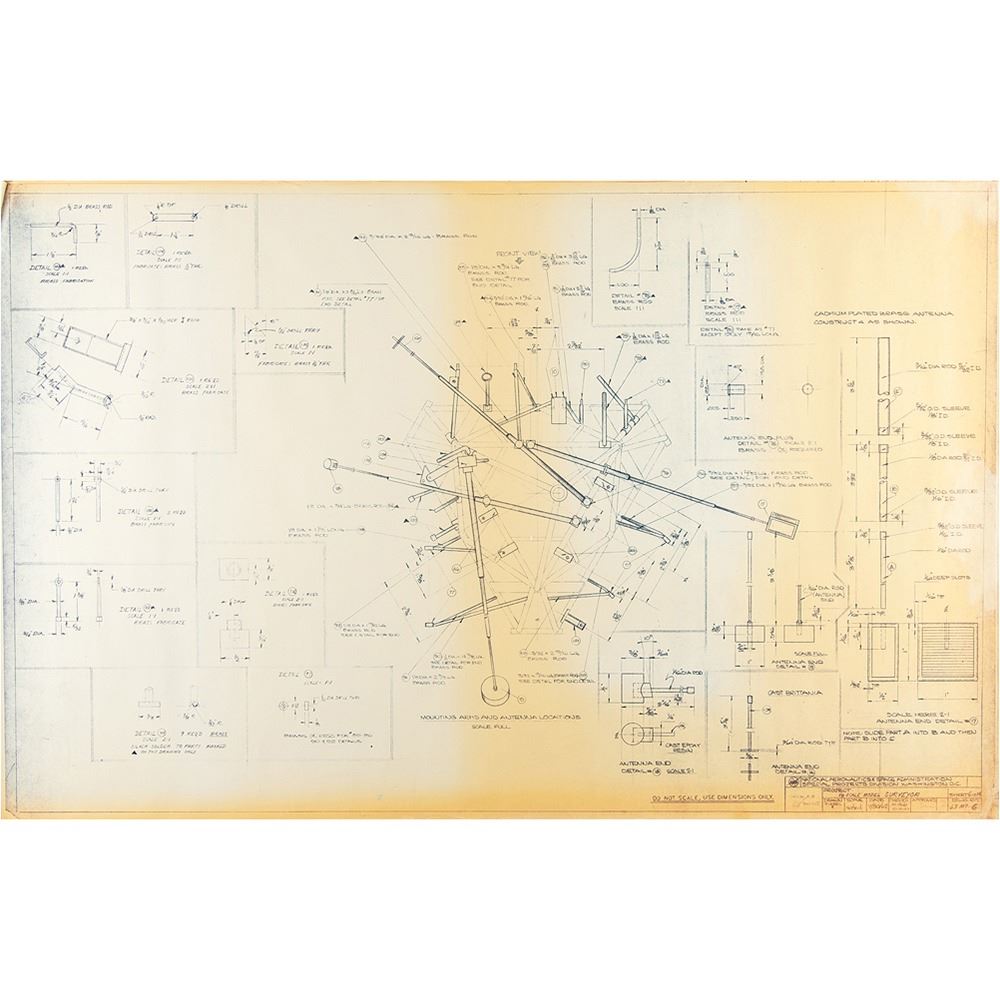 Fascinating complete set of 14 NASA ‰Û÷Special Projects Divison‰Ûª blueprints for a 1:8 scale model of the Surveyor 1 space probe, the first lunar soft-lander in NASA‰Ûªs uncrewed Surveyor program, which successfully gathered data about the lunar surface that would be needed for the crewed Apollo moon landings. Each blueprint measures 34.25è x 22è and features various illustrated angles of the proposed model, all of which are meticulously and impressively rendered, in addition to numerous highly detailed diagrams related to the measurements, materials, and equipment needed for its construction. The lower right corner of each sheet contains a legend listing information like the project, artist, drawing number, and date (September and October of 1962). The final sheet contains a list of 109 details or parts that make up the model, the majority of which are brass. Rolled and in very good to fine condition, with some light dampstaining and edge wear; all but three of the sheets are stapled together.