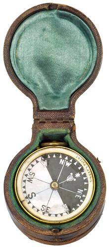 Taschen-Barometer und Kompaß, um 1900 Holosteric-Barometer in Messingfassung, unbezeichnet, mit drehbarem Limbus zum Ablesen von Höhen (Angaben in Feet), versilberte Metallskala (Ø 4,5 cm), Rückseite mit Trockenkompaß, bezeichnet "Singer's Patent", Kompaßkarte aus Perlmutt. Im Original-Lederetui.