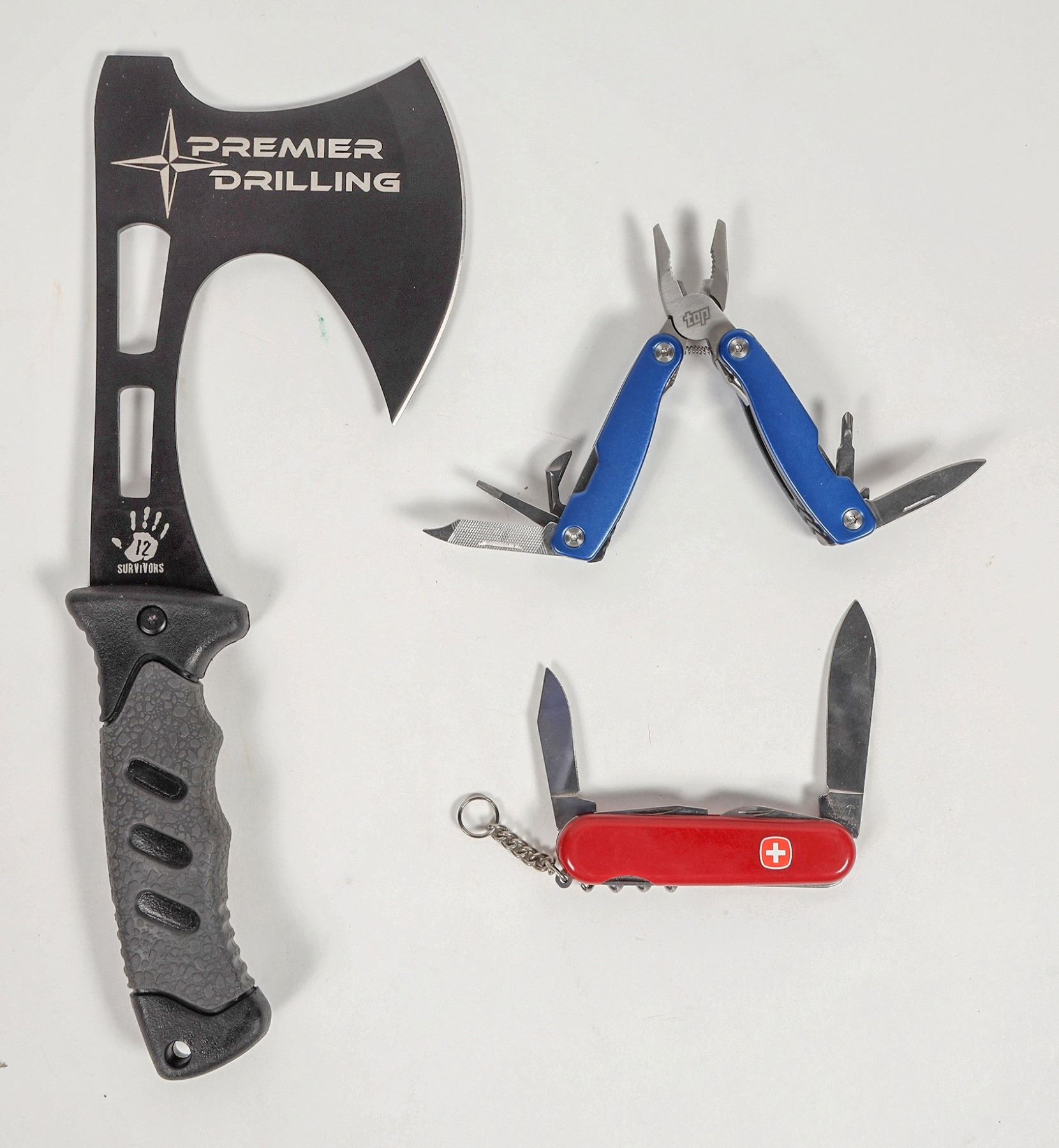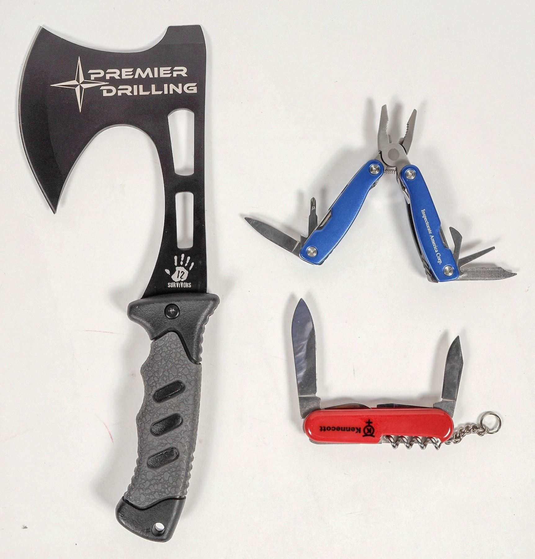 There is a Survivor 12 hatchet 12 in. like new condition. There is also a multi-tool in anodized aluminum plus a Swiss army knife in like new condition endorsed to Kennecott. That rounds out your survival kit. Please see photo for details.