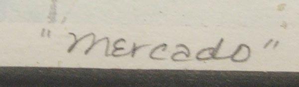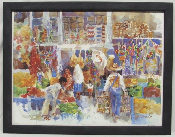 Susan Amstater Framed Signed Numbered Lithograph. Titled ''Mercado'', signed in pencil, 106/150. Framed in a wood frame, under glass, measures approx. 16'' x 21''. SHI $35.