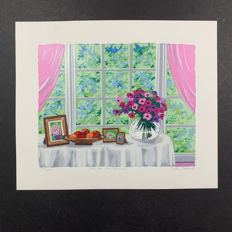 Susan Ann Scollard's "Still Life with Anemones" lmited edition print, signed lower right, titled lower middle, and numbered 77/200 lower left. This piece is of bouquet of flowers in a glass bowl, a few framed pictures and a bowl of fruit, on top of a table in front of a window. This piece is in excellent condition.
