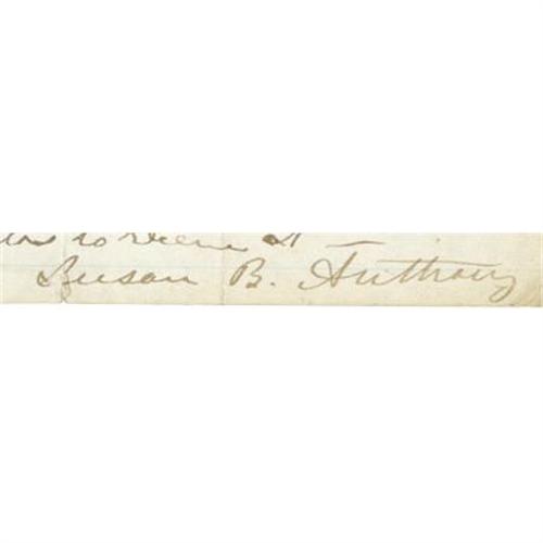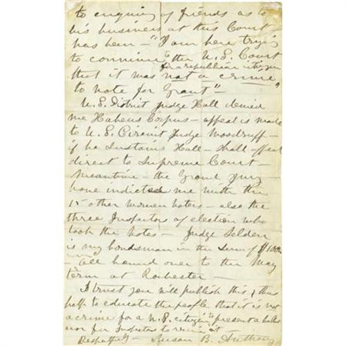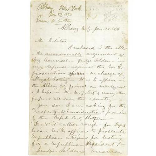 <B>Susan B. Anthony Autograph Letter Signed in full, "</B></I><I>Susan B. Anthony".</B></I> One page, 5" x 7.5", Albany, New York, January 27, 1873 to an editor concerning her famous vote for president in 1872 which resulted in her arrest. In an effort to publicize her cause, she begs that her counsel's "<I>argument...in my defense against the U.S. prosecution on charge of 'illegal voting'</B></I>" be published. Appreciating the irony of the situation she observes: "<I>...You see I am asking for the 'respectful consideration' promised by the Repub. Party Platform, - Isn't it rather rough - for Republican U. S. officers to prosecute republican citizens for voting for a republican President?...U.S. District judge Hall denied me Habeus Corpus - an appeal is made to U.S. Circuit Judge Woodruff - if he sustains Hall - shall appeal direct to Supreme Court... I am here trying to convince the U.S. Court that it was not a crime to vote for Grant...</B></I>" Anthony arranged for 3,000 copies of the argument to be published as pamphlets. While she waited for their printing, she mailed page proofs to editors as far away as St. Louis, asking all to publish the argument. This is a wonderful letter concerning her most significant <I>cause célèbre.</B></I> Despite her very strong arguments, using the 14th Amendment in particular, she was unsuccessful and was forced to pay a $100 fine, which she openly refused to pay. The state declined to pursue the matter further. A superb letter from one of the giants of the women's suffrage movement. Provenance, Charles Hamilton, 1953. Folds, light soiling, else very good. <I>Ex. Henry E. Luhrs Collection.</B></I><BR><BR><BR><b>Shipping:</b> Flat Material, Small (<a target="_blank" href="http://www.heritageauctions.com/common/shipping.php">view shipping information</a>)