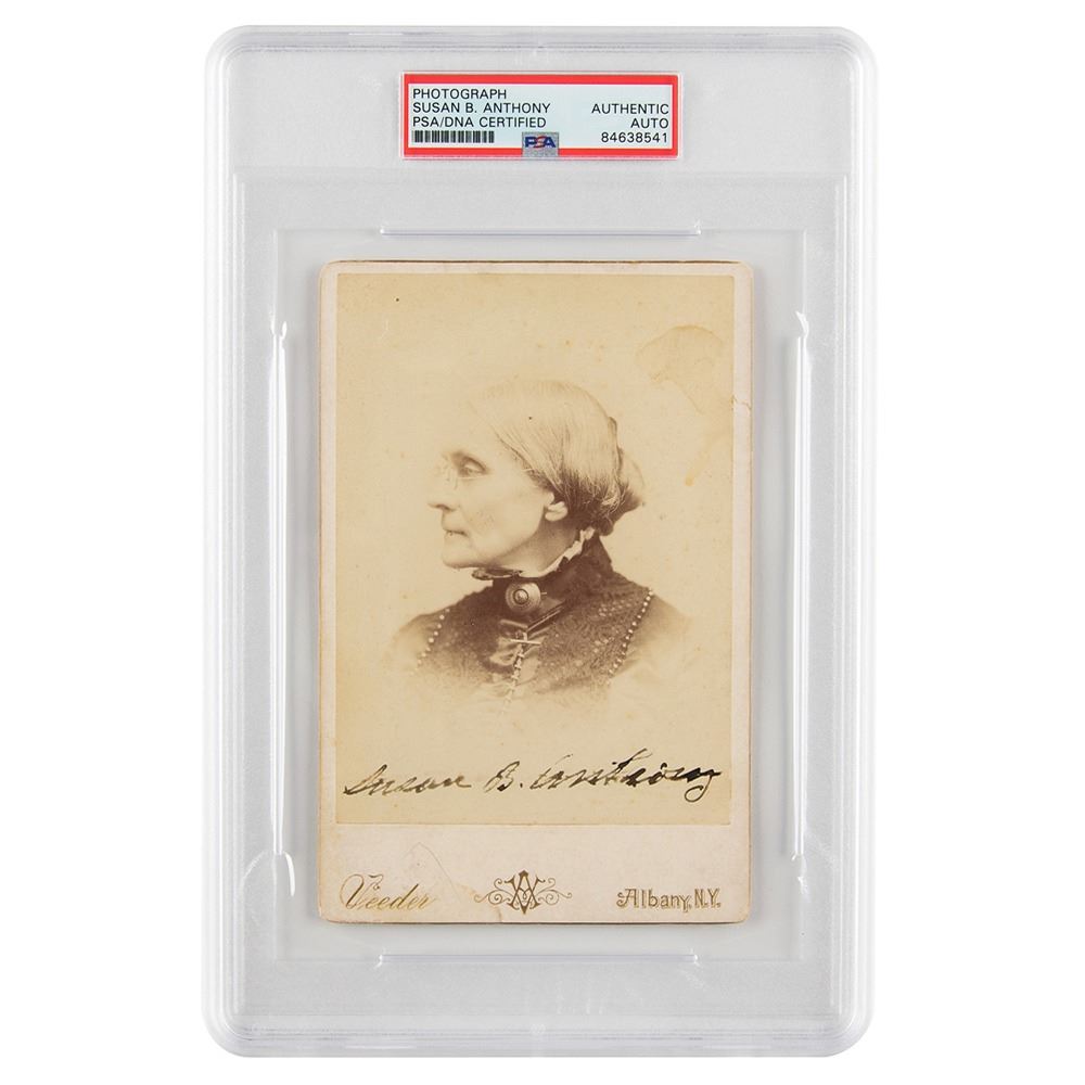 Rare 4.25 x 6.5 cabinet portrait of Anthony in an intense profile pose by Veeder of Albany, New York, signed at the bottom of the image in black ink, "Susan B. Anthony." In very good to fine condition, with some light stains and scuffing, and minor brushing to the signature. Encapsulated in a PSA/DNA authentication holder.