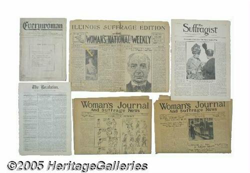 <B>Susan B. Anthony's Weekly Newspaper "The Revolution"</B></I> Here is a 1870 issue of Susan B. Anthony's newspaper that she published to promote Woman's Suffrage. Also included in this lot are copies of other Suffrage newsletters from the early 20th century used to advance the cause of Woman's Rights. Lot:261