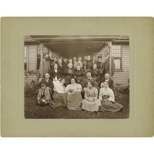 <B>Susan B. Anthony with Presumed Family Members: A Companion Photograph to the Previous Lot.</B></I> Also measuring 9.5" x 7.75" (11" x 13.5" on original mount), and in excellent condition. While the other photo was unmarked, this one bears the "Parsons" imprint of the photographer. An old pencil notation on the reverse of the mat identifies one of those pictured as Anthony's younger brother, Daniel Reed Anthony. It also notes that her family descended from John Anthony, who came from England in 1634 and settled in Portsmouth, Rhode Island. <BR><BR>While lacking the content of the previous lot, this is none the less an important, large original photo of the great woman's rights leader, and potentially a very useful image for a biographer attempting to detail her family history.