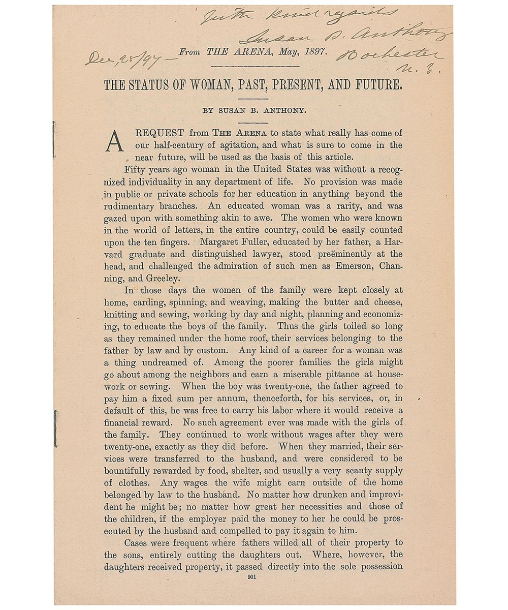 Original pamphlet of Anthony’s article titled “The Status of Woman, Past, Present, and Future” (originally printed in The Arena, May 1897), 6 x 9, eight pages, signed in ink at the top of the first page, “With kind regards, Susan B. Anthony, Rochester, N.Y., Dec. 28/97.” In fine condition. A great example of Anthony’s reflections on the efforts to change the status of women that had taken place since the Seneca Falls Convention of 1848.
