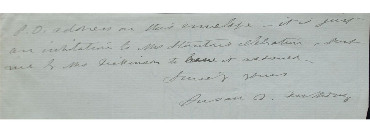 Susan Brownell Anthony (February 15, 1820 – March 13, 1906) was a prominent American civil rights leader who played a pivotal role in the 19th century women's rights movement to introduce women's suffrage into the United States. She was co-founder of the first Women's Temperance Movement with Elizabeth Cady Stanton as President Susan B. Anthony: Autograph note signed in reference to an invitation for Mrs. Stanton's celebration.