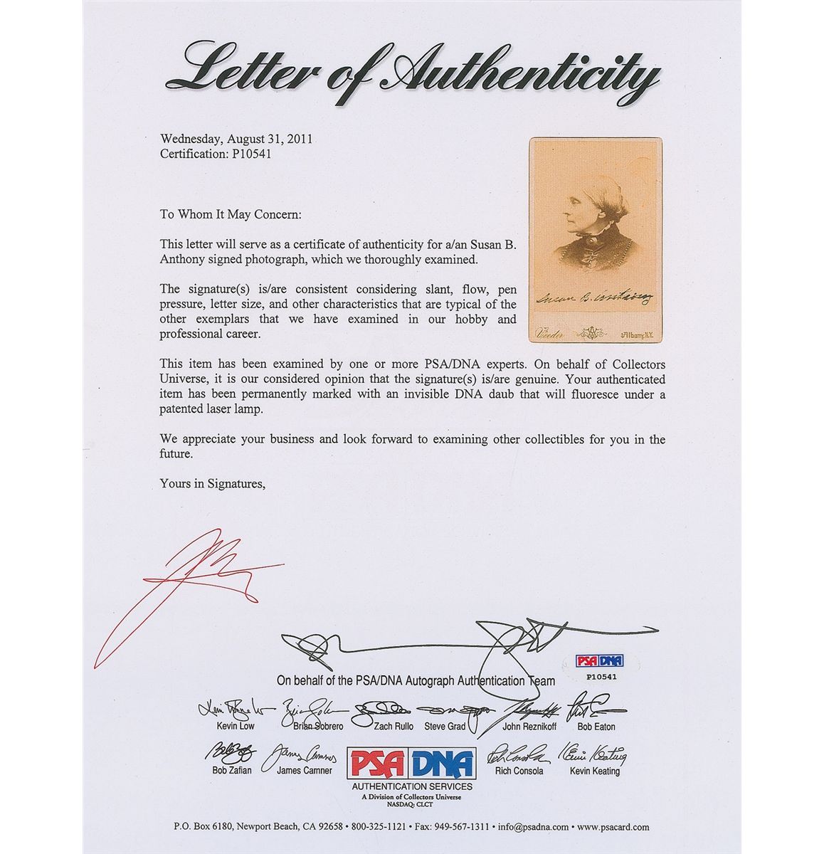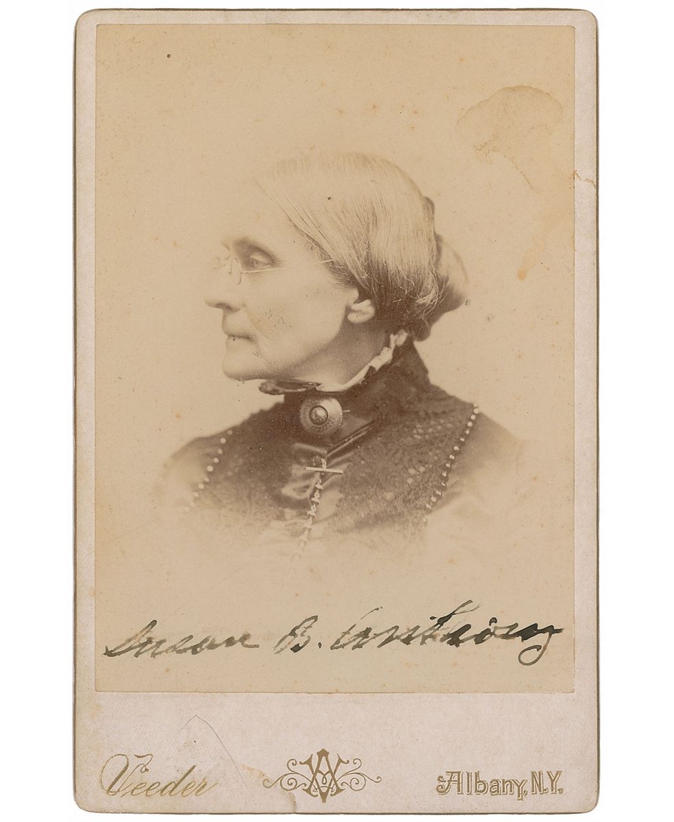 Rare 4.25 x 6.5 cabinet portrait of Anthony in an intense profile pose, signed at the bottom of the image in black ink, “Susan B. Anthony.” Published by Veeder of Albany, New York. Light stains to the lower left (affecting only the mount) and upper right (confined to the background), and a bit of brushing and feathering to the signature, otherwise fine condition. Accompanied by a full letter of authenticity from PSA/DNA.