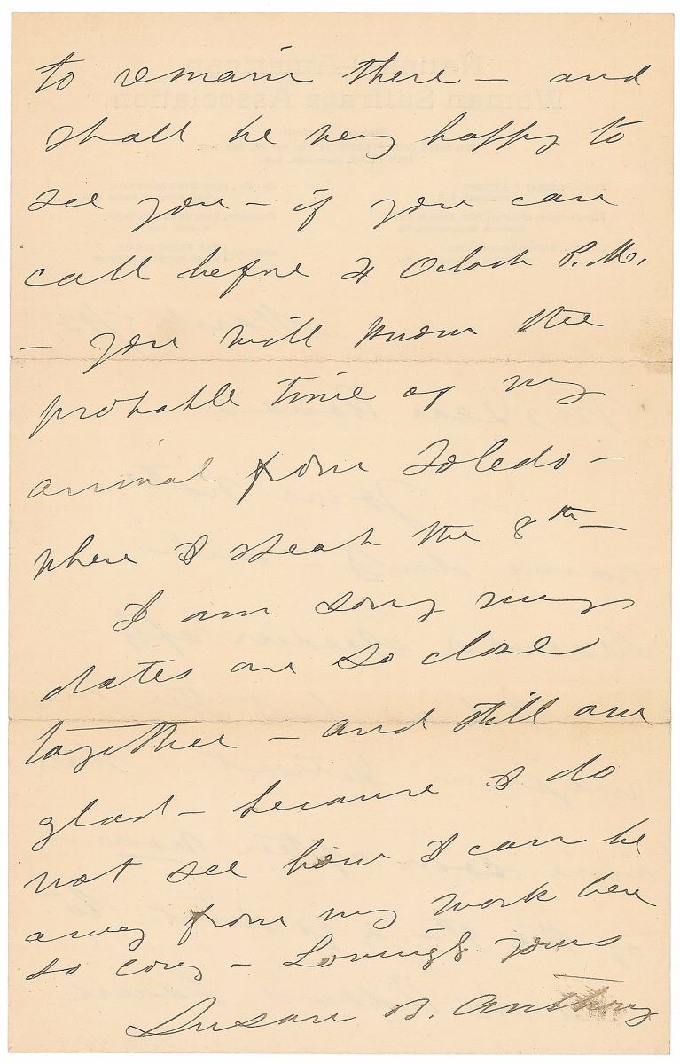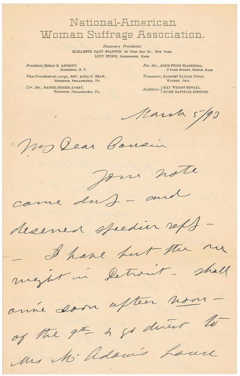ALS, one page both sides, 5.75 x 9, National-American Woman Suffrage Association letterhead, March 5, 1892. Letter to her cousin, in part: “I have but the one night in Detroit—shall arrive soon after noon—of the 9th…and shall be very happy to see you, if you can call before 4 o’clock p.m. You will know the probable time of my arrival from Toledo.” In fine condition, with some brushing to the last name of the signature and a partial separation to right edge.