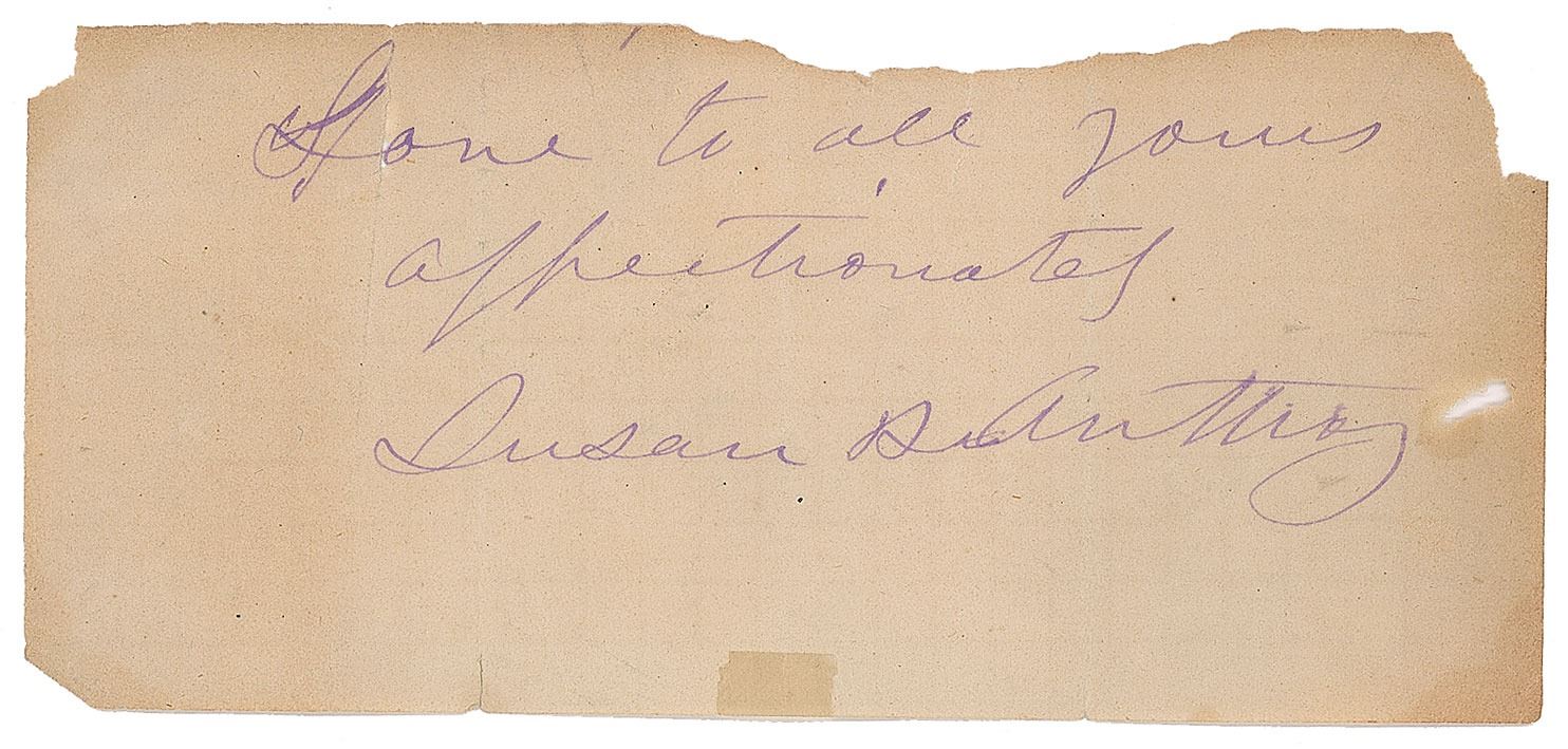 Vintage ink signature, "Love to all yours, affectionately, Susan B. Anthony,” on an off-white 5 x 2.25 slip. In very good condition, with a tear to the irregular top edge, a small hole to the right of the signature, and a small piece of old tape to the bottom edge.