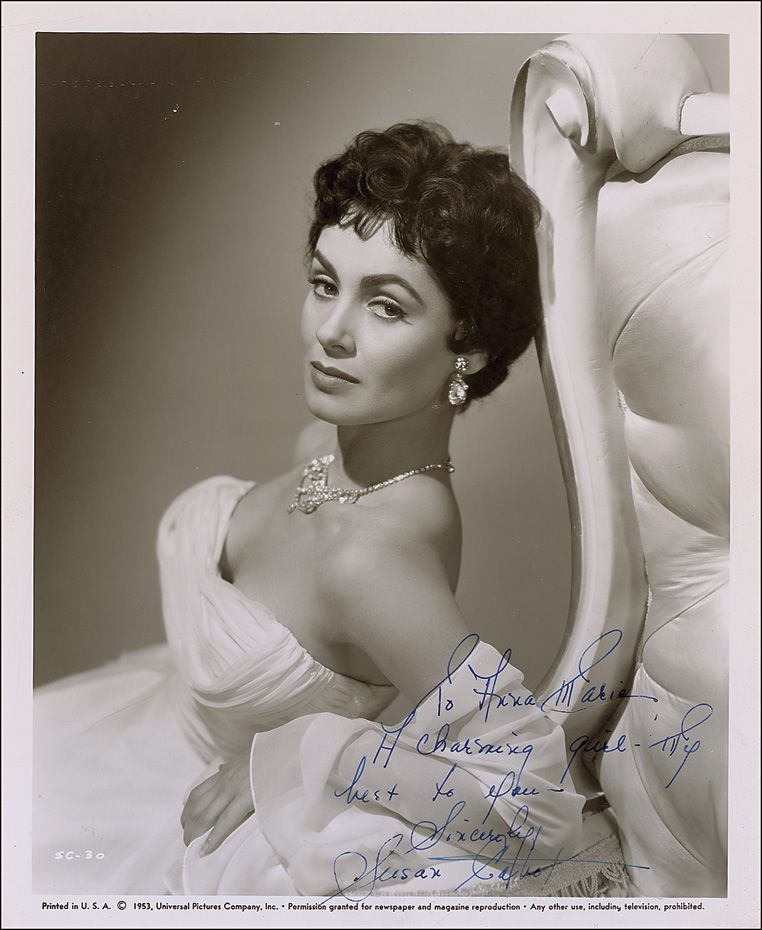 Vintage glossy 8 x 10 Universal Pictures publicity photo of Cabot in chiffon and diamonds, signed and inscribed in fountain pen, “To Anna Marie, A charming girl–My best to you-Sincerely, Susan Cabot.” In fine condition, with central horizontal mark running through the image, not affecting the signature.