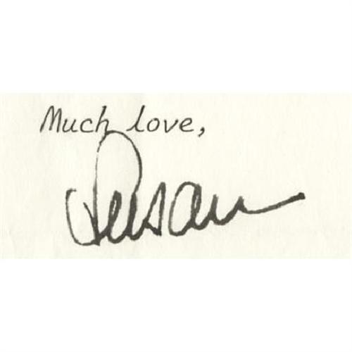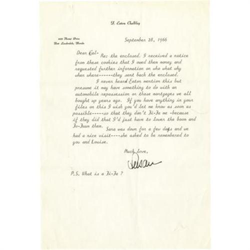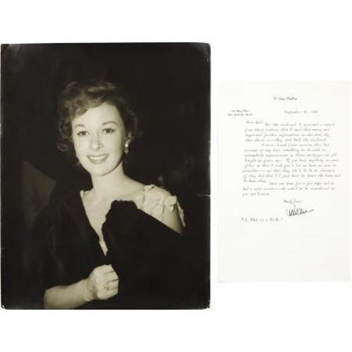 <B>Susan Hayward Signed Letter and Unpublished Photograph.</B></I> Besides having been one of Hollywood's all-time most beautiful actresses, the distinctions of Susan Hayward include an Academy Award for <I> Want to Live!</B></I> (1958) and having the only footprints in Grauman's Chinese Theatre's forecourt set in gold dust. This amusing 7.5" x 10.5" typed letter is on the personal stationary of Hayward's late husband (F. Eaton Chalkley), dated September 28, 1966, and written from her home in Florida to a business friend regarding a bill sent to her: "...I received a notice from these cookies that I owe them money... If you have anything in your files on this I wish you'd let me know as soon as possible -- so that they don't Fi-Fa me -- because if they did that I'd just have to lower the boom and Fo-Fuum them..." She concludes the letter "Much love, Susan" in black ink and adds a typed "P.S. What is a Fi-Fa?". The letter, written shortly before the release of <I>Valley of the Dolls</B></I> (in which Hayward replaced Judy Garland) comes with the original mailing envelope postmarked Fort Lauderdale, Fla. ("Susan Hayward Very Funny" is written in pencil on it by a previous owner) and the $67.68 bill notice in question. The address where Hayward lived in Ft. Lauderdale after her husband's death appears on both the letter and the envelope. Susan Hayward was a great film actress and personality and this letter perfectly captures her vivacity and humor. In Very Fine condition. Also included is a large-format photo of a radiant Hayward, with a handwritten note en verso reading: "Susan Hayward photo taken by Uncle Wayne, 1952." The photograph measures 11" x 14", and though there are minor areas of border and corner wear it is in overall Very Fine condition. <I>Accompanied by a COA from PSA/DNA.</B></I><BR><BR><b>Shipping:</b> Flat Material, Small (<a target="_blank" href="http://www.heritageauctions.com/common/shipping.php">view shipping information</a>)