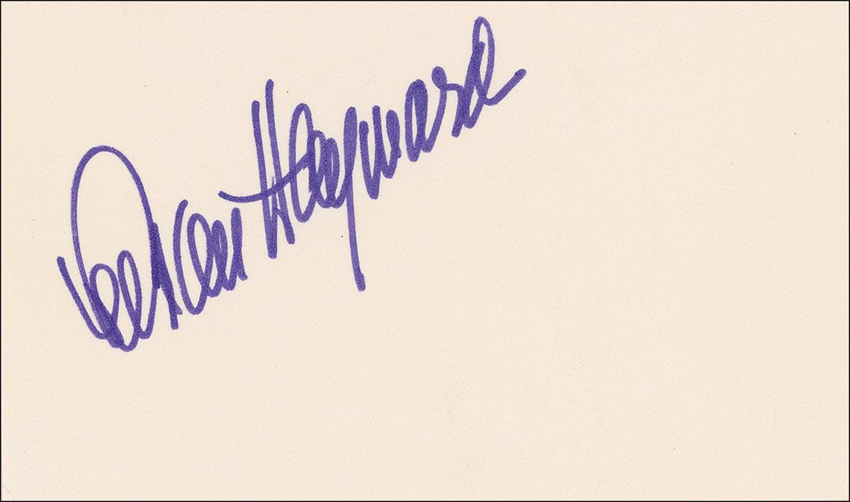 Purple felt tip in-person signature, “Susan Hayward,” on an off-white 5 x 3 card. In very fine condition.