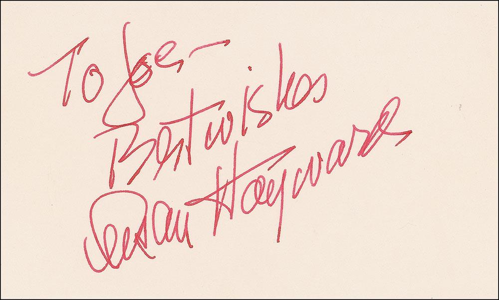 Much-adored American actress (1917–1975) who won the Academy Award for Best Actress for her penetrating, multidimensional portrayal of death-row inmate Barbara Graham in the 1958 classic I Want to Live! Vintage in-person ink signature and inscription, “To Joe–Best wishes, Susan Hayward,” on a 5 x 3 card. In very fine condition.