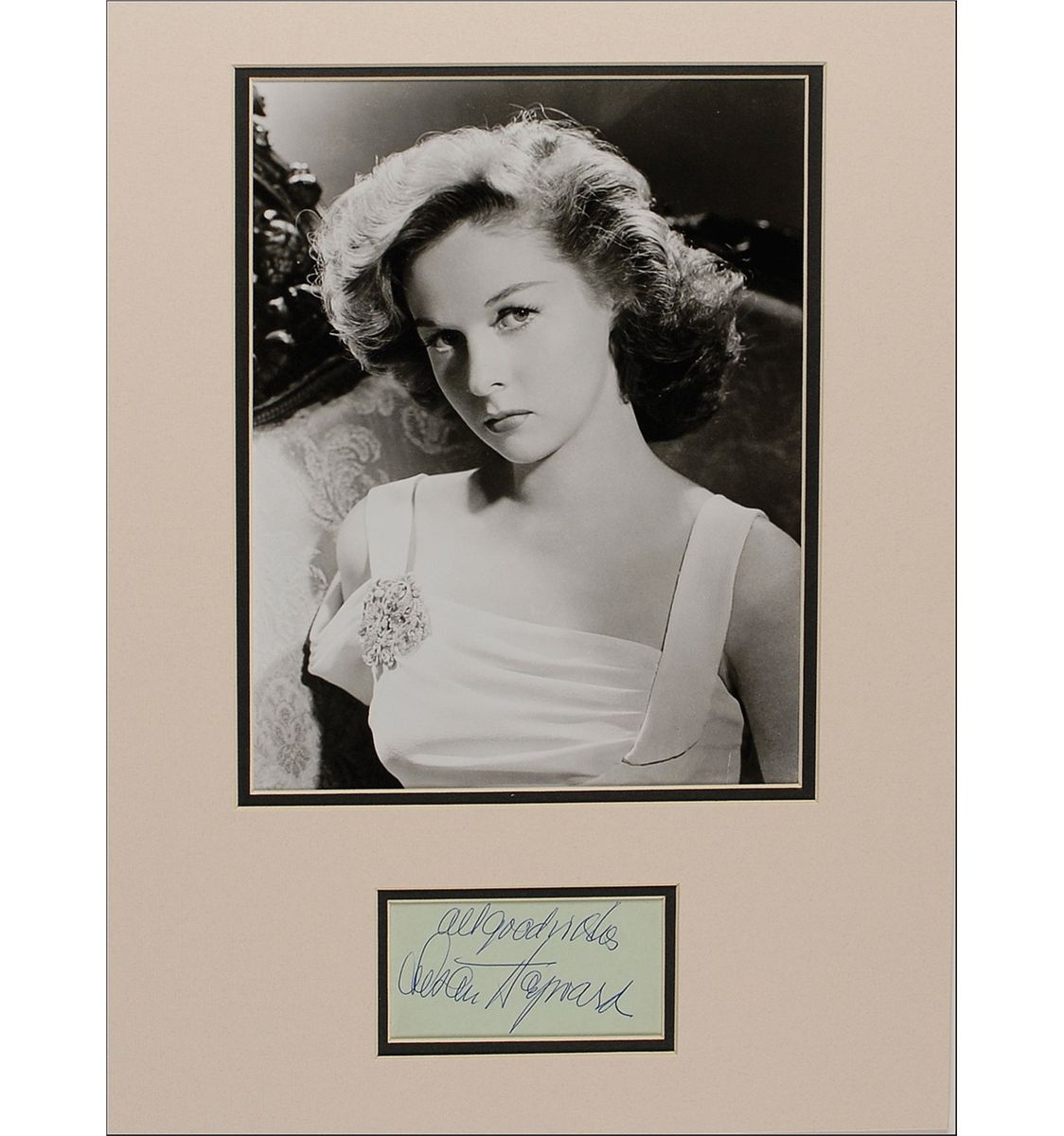 Ballpoint signature, “All good wishes, Susan Hayward,” on a light green album page. Double matted, with a glossy portrait of Hayward, to an overall size of 11.5 x 15.75. In fine condition.