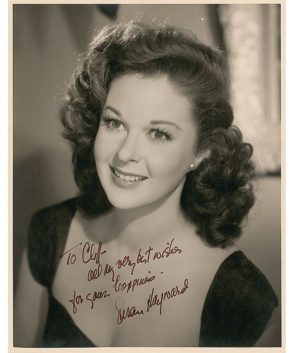 Attractive vintage matte-finish 11 x 14 photo, signed and inscribed in fountain pen, “To Cliff—All my very best wishes for your happiness—Susan Hayward.” A few creases to background along right side, and some light rippling, creases, and surface loss along top, not detracting from the overall appearance, otherwise fine condition.